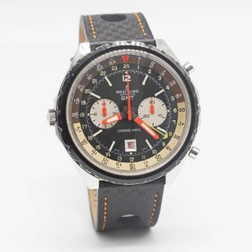 A RARE GENTLEMAN'S STAINLESS STEEL BREITLING GMT CHRONO-MATIC CHRONOGRAPH WRIST WATCHCIRCA 1970, REF. 2115Movement: 17J, automatic, base cal. 11, signed Breitling.Case: Width approx. 48mm, screw back, signed Breitling, numbered 1,3xx,xxx, slide rule bezel, Breitling crown.Strap: Leather.CONDITION REPORTDial: Original dial in excellent condition, showing some small signs of age.Movement: Running & functioning at present, timekeeping and accuracy cannot be guaranteed.Case: In very good condition, with light scratches due to general use.Strap/Bracelet: In excellent condition.