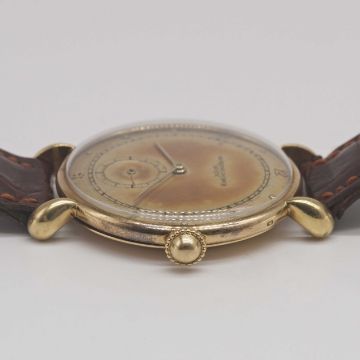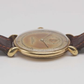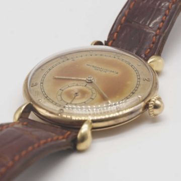 A GENTLEMAN'S LARGE SIZE 18K SOLID GOLD VACHERON & CONSTANTIN WRIST WATCHCIRCA 1950, WITH "CREME BRULÉE" DIAL & "TEARDROP" LUGSMovement: 17J, manual wind, cal. P453/2C, signed Vacheron & Constantin, numbered 45x,xxx.Case: Diameter approx. 36mm, snap back, signed Vacheron & Constantin, numbered 29x,xxx, 18k Swiss hallmarks, original crown.Strap: Leather.CONDITION REPORTDial: Original dial in fair condition, showing signs of age & a strong patina.Movement: Running & functioning at present, timekeeping and accuracy cannot be guaranteed.Case: In very good condition, with light scratches due to general use.Strap/Bracelet: In poor condition.