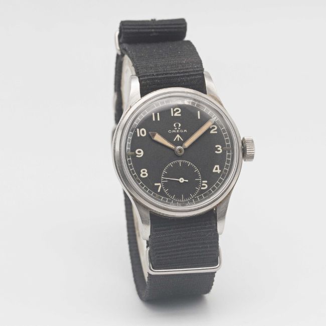 A GENTLEMAN'S STAINLESS STEEL BRITISH MILITARY OMEGA W.W.W. WRIST WATCHCIRCA 1945, PART OF THE "DIRTY DOZEN"Movement: 15J, manual wind, cal. 30T2, signed Omega, numbered 10,xxx,xxx.Case: Diameter approx. 35mm, fixed bars, screw back, signed Omega Watch Co, issue markings W.W.W. ^ Y23852 10688051.Strap: NATO.CONDITION REPORTDial: Original dial in excellent condition.Movement: Running & functioning at present, timekeeping and accuracy cannot be guaranteed.Case: In excellent condition, with some small scratches due to use.Strap/Bracelet: In good condition.