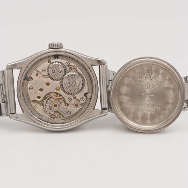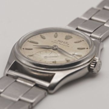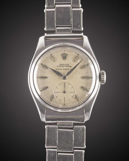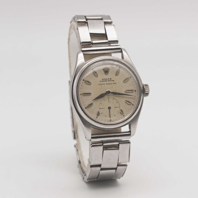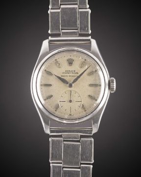 A GENTLEMAN'S STAINLESS STEEL ROLEX OYSTER ROYAL SHOCK RESISTING BRACELET WATCHCIRCA 1951, REF. 6044 WITH "COFFIN" MARKERS & "DAGGER" HANDSMovement: 15J, manual wind, cal. 700, signed Rolex.Case: Diameter approx. 32mm, Oyster case, signed Rolex, numbered 72x,xxx, Rolex Super Oyster crown.Bracelet: WAB Made in England expanding riveted bracelet.CONDITION REPORTDial: Original dial in good condition, showing signs of age.Movement: Running & functioning at present, timekeeping and accuracy cannot be guaranteed.Case: In very good condition, with light scratches due to general use.Strap/Bracelet: In fair condition, with wear & scratches due to general use.