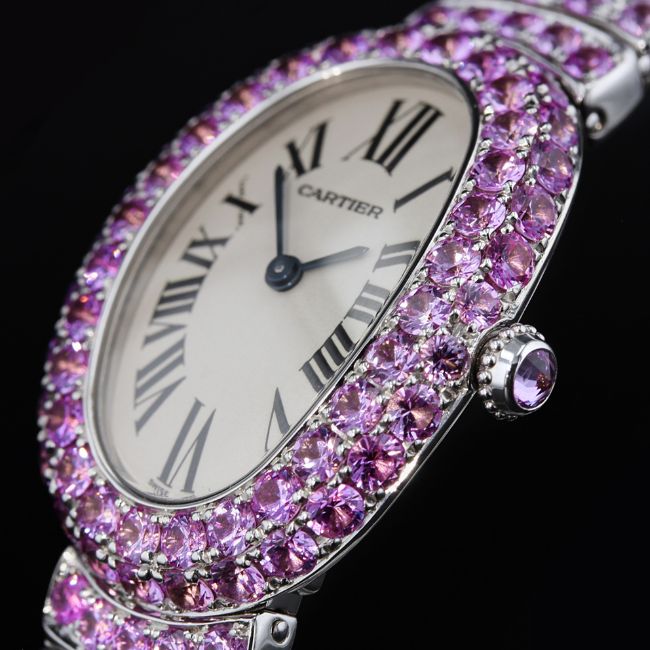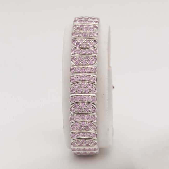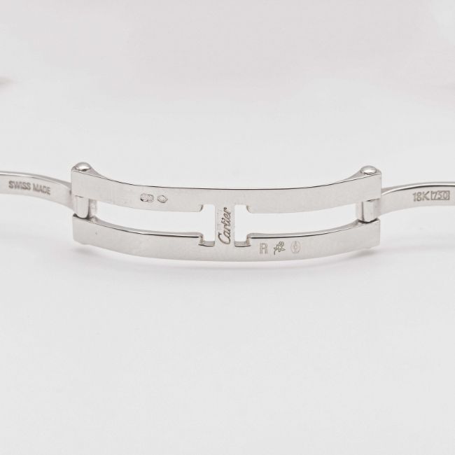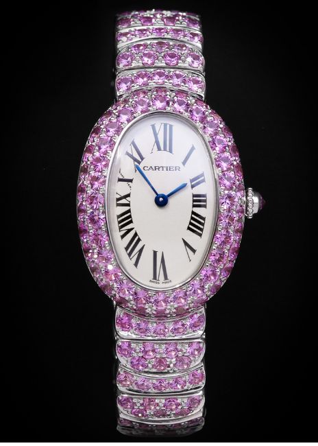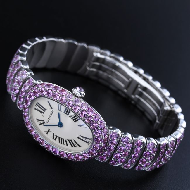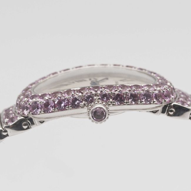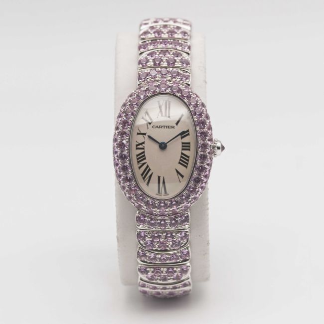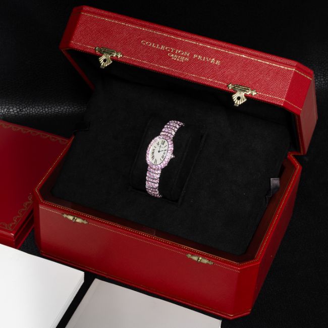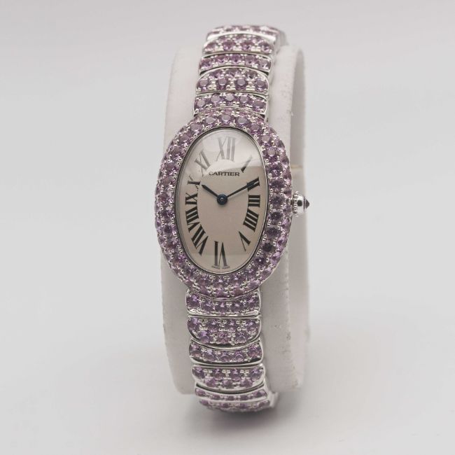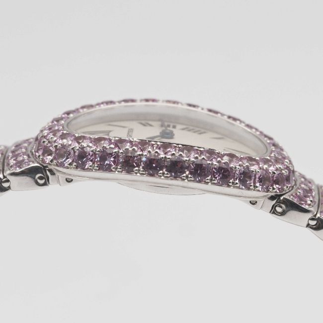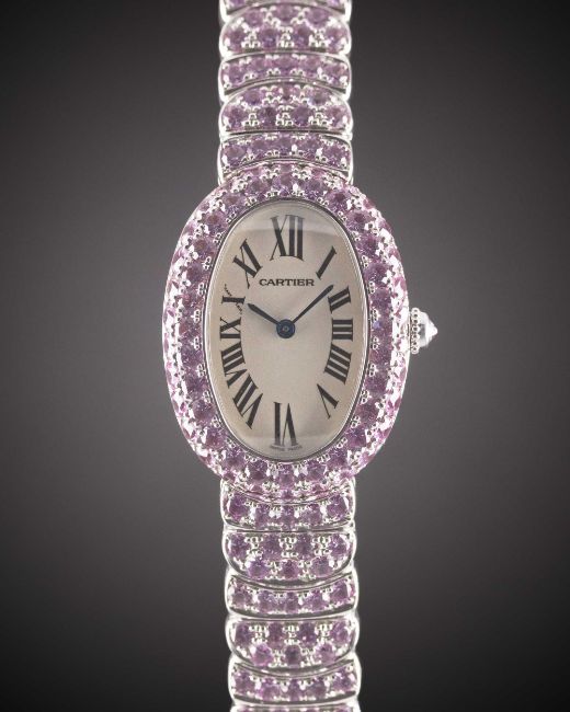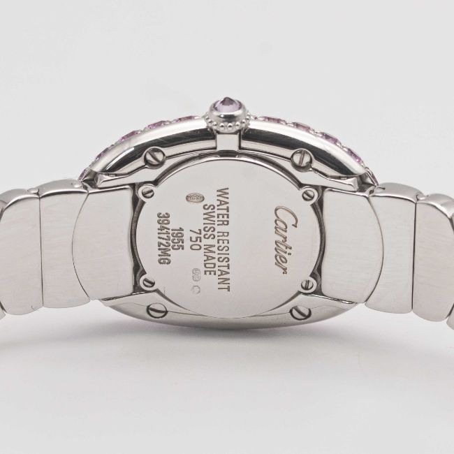 A FINE & VERY RARE LADIES 18K SOLID WHITE GOLD & PINK SAPPHIRE CARTIER BAIGNOIRE BRACELET WATCHCIRCA 2005, REF. 1955 PART OF THE PRIVEE COLLECTION WITH ORIGINAL BOXMovement: Quartz, signed Cartier.Case: Approx. 31mm/23mm, signed Cartier, numbered, 18k hallmarks, factory set with pink sapphires, original pink sapphire crown.Bracelet: Original 18k solid gold bracelet with factory set pink sapphires.CONDITION REPORTDial: Original dial in excellent condition.Movement: Running & functioning at present, timekeeping and accuracy cannot be guaranteed.Case: In excellent condition.Strap/Bracelet: In excellent condition.