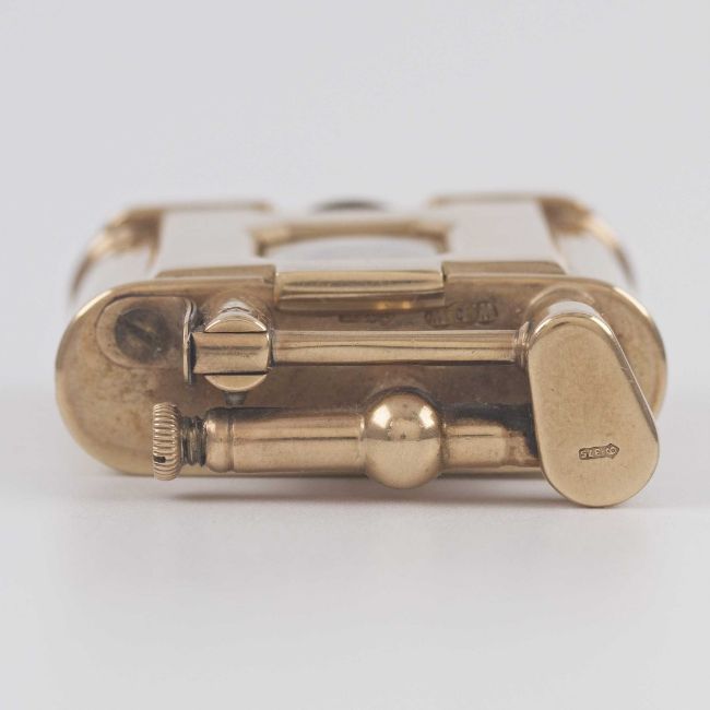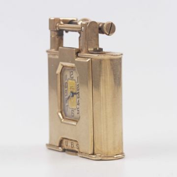 A RARE 9CT SOLID GOLD DUNHILL UNIQUE WATCH LIGHTERCIRCA 1930, WITH ORIGINAL FITTED DUNHILL BOXMovement: 15J, manual wind.Case: Approx. 46mm by 36mm by 12mm, signed Dunhill, numbered, 9ct London hallmarks, maker's mark W.F.W, initials engraved to the case front & engraving to the case back.CONDITION REPORTDial: Dial in good condition.Movement: Running & functioning at present, timekeeping and accuracy cannot be guaranteed.Case: In very good condition, with some light scratches due to general use. Please note that we cannot ship this lot due to restrictions and we would require the winning bidder to arrange collection or shipping.