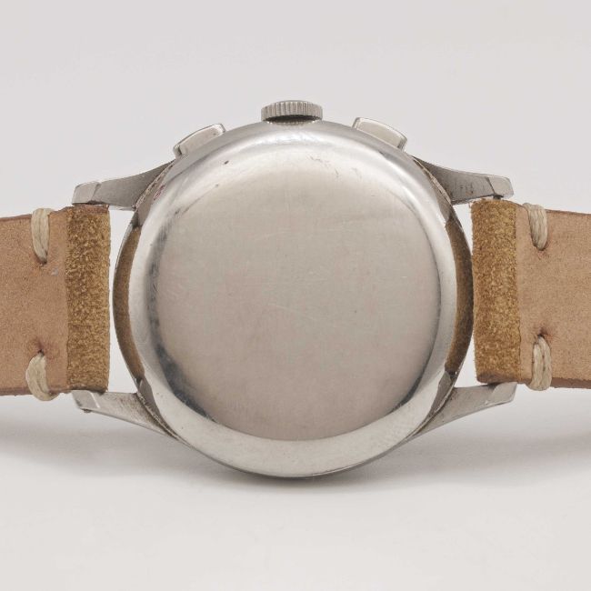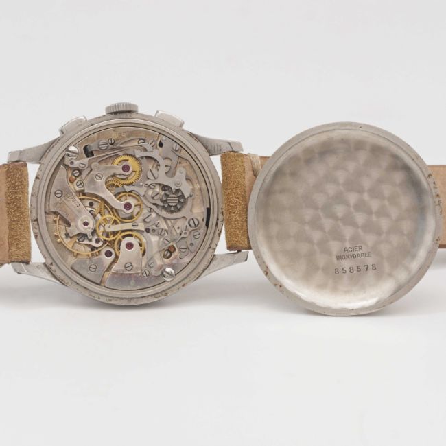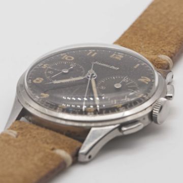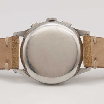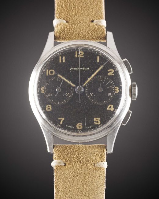 A GENTLEMAN'S STAINLESS STEEL EXCELSIOR PARK CHRONOGRAPH WRIST WATCHCIRCA 1950s, WITH GLOSS BLACK "TROPICAL" DIAL Movement: Manual wind, Excelsior Park calibre EP4.Case: Diameter approx. 36mm, "stepped" bezel, snap back, numbered 85x,xxx.Strap: Suede.CONDITION REPORTDial: Original dial in very good "tropical" condition.Movement: Running & functioning at present, timekeeping and accuracy cannot be guaranteed.Case: In excellent condition, with light scratches due to general use.Strap/Bracelet: In excellent condition.