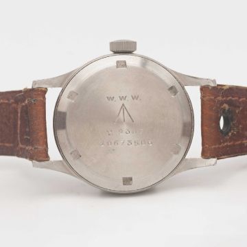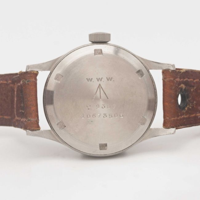 A GENTLEMAN'S STAINLESS STEEL BRITISH MILITARY OMEGA W.W.W. WRIST WATCHCIRCA 1945, PART OF THE "DIRTY DOZEN"Movement: 15J, manual wind, cal. 30T2, signed Omega, numbered 10,xxx,xxx.Case: Diameter approx. 35mm, fixed bars, screw back, signed Omega Watch Co, issue markings W.W.W. ^ Y 9307 10673506.Strap: Leather.CONDITION REPORTDial: Original dial in very good condition, showing small signs of age.Movement: Running & functioning at present, timekeeping and accuracy cannot be guaranteed.Case: In very good condition, with small scratches due to use.Strap/Bracelet: In fair condition.