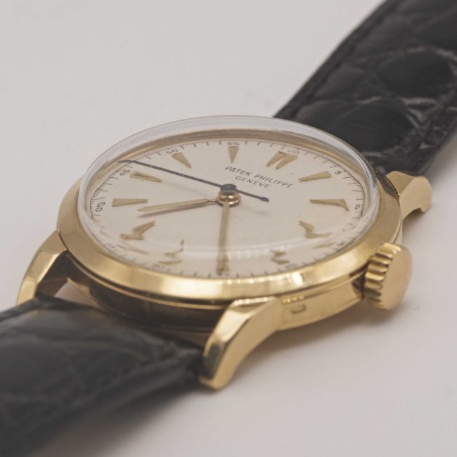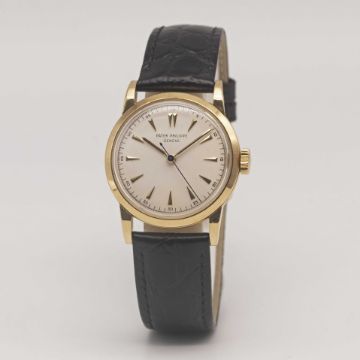 A GENTLEMAN'S 18K SOLID YELLOW GOLD PATEK PHILIPPE CALATRAVA "CENTRE SECONDS" WRIST WATCHCIRCA 1950, REF. 2460 WITH REFINISHED DIALMovement: 18J, manual wind, cal. 27SC, signed Patek Philippe & Co, numbered 70x,xxx.Case: Diameter approx. 32mm, faceted lugs, snap back, signed Patek Philippe & Co., numbered 66x,xxx, 18k hallmarks.Strap: Leather.CONDITION REPORTDial: Refinished dial in very good condition.Movement: Running & functioning at present, timekeeping and accuracy cannot be guaranteed.Case: In very good condition, with light scratches due to general use.Strap/Bracelet: In excellent condition.