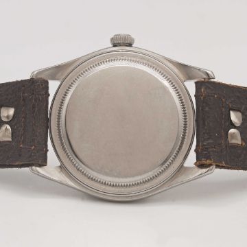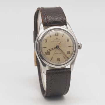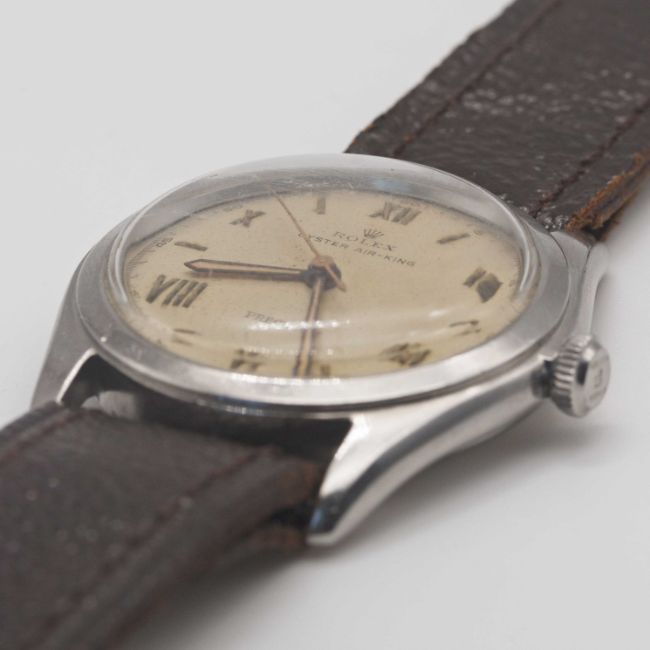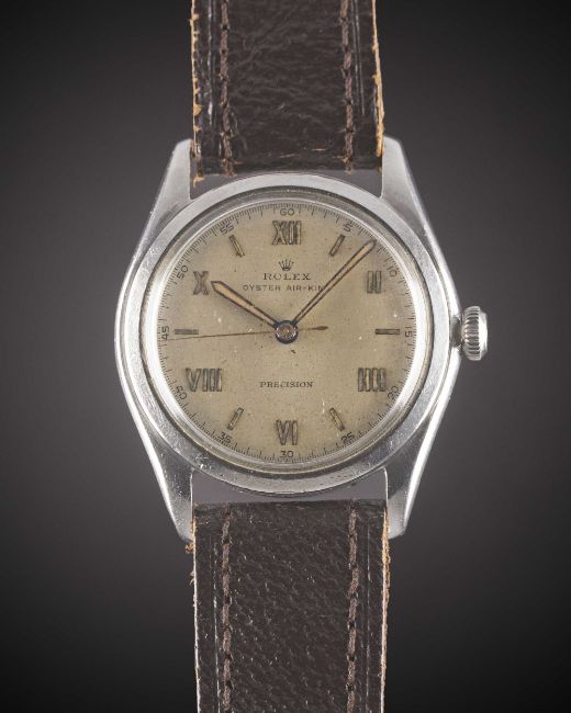 A GENTLEMAN'S STAINLESS STEEL ROLEX OYSTER AIR KING PRECISION WRIST WATCHCIRCA 1946, REF. 4499 WITH LUMINOUS ROMAN NUMERALS, ACCOMPANIED BY ORIGINAL BOX & INSTRUCTION PAMPHLETMovement: 17J, manual wind, signed Rolex Patented Superbalance.Case: Diameter approx. 34mm, Oyster case, signed Rolex, numbered 35x,xxx, Rolex Oyster crown.Strap: Leather.CONDITION REPORTDial: Original dial in fair condition, showing signs of age & light bubbling to the surface.Movement: Running & functioning at present, timekeeping and accuracy cannot be guaranteed.Case: In very good condition, with some scratches due to general use.Strap/Bracelet: In excellent condition.