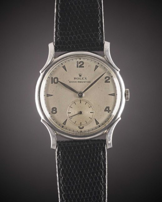 A GENTLEMAN'S STAINLESS STEEL ROLEX SHOCK RESISTING WRIST WATCHCIRCA 1950s, REF. 4542 WITH MIRRORED SILVER MARKERSMovement: 15J, manual wind, cal. 700, signed Rolex.Case: Diameter approx. 32mm, "horn" lugs, snap back, Rolex coronet to outer case back, signed Rolex, no number, Rolex crown.Strap: Leather.CONDITION REPORTDial: Original dial in very good condition, showing some signs of age.Movement: Running & functioning at present, timekeeping and accuracy cannot be guaranteed.Case: In good condition, with light scratches due to general use.Strap/Bracelet: In excellent condition.