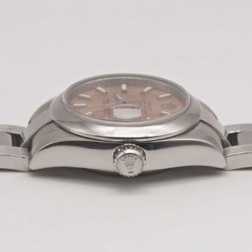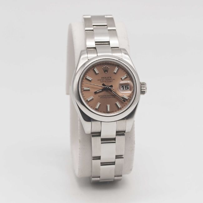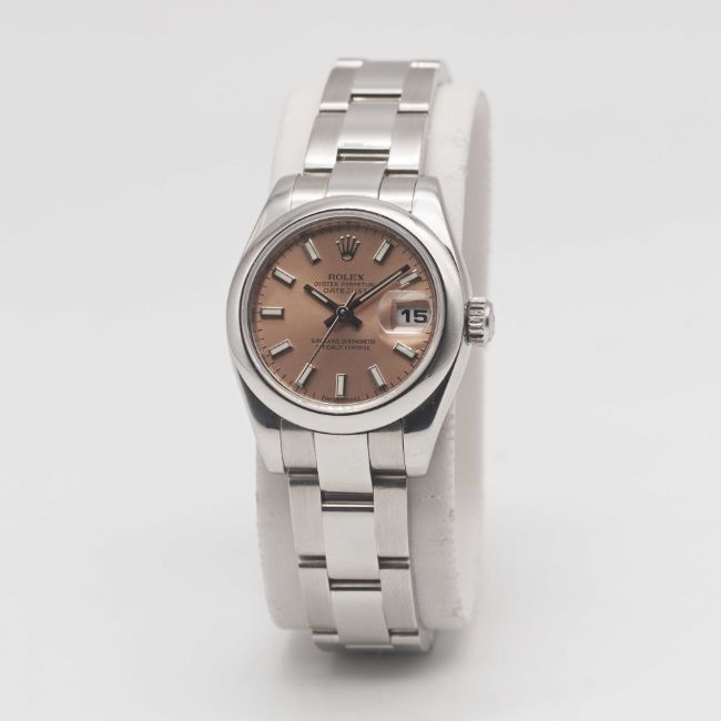 A LADIES STAINLESS STEEL ROLEX OYSTER PERPETUAL DATEJUST BRACELET WATCHCIRCA 2007, REF. 179160 WITH SALMON DIAL, ACCOMPANIED BY ROLEX BOXMovement: 31J, automatic chronometer, quick-set date, cal. 2235, signed Rolex S.A., numbered.Case: Diameter approx. 26mm, Oyster case, signed Rolex S.A., Z serial no., smooth bezel, sapphire crystal, Rolex crown.Bracelet: Original Rolex Oyster bracelet, clasp marked PJ6.CONDITION REPORTDial: Original dial in excellent condition.Movement: Running & functioning at present, timekeeping and accuracy cannot be guaranteed.Case: In excellent condition.Strap/Bracelet: In excellent condition.