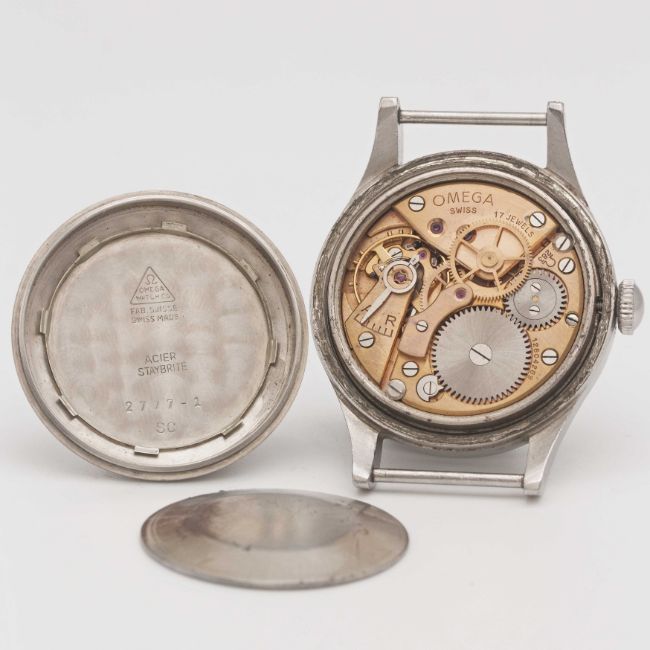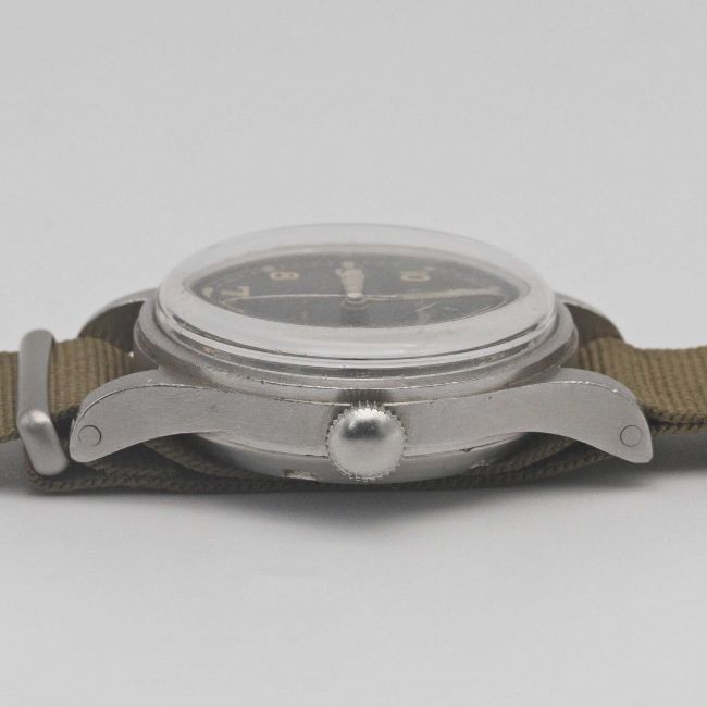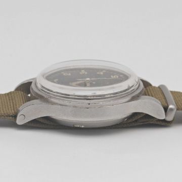 A RARE GENTLEMAN'S STAINLESS STEEL BRITISH MILITARY OMEGA RAF PILOTS WRIST WATCHDATED 1953, REF. 2777-1 SC WITH ORIGINAL "THIN ARROW" DIALMovement: 17J, manual wind, cal. 283, signed Omega, numbered 12,xxx,xxx.Case: Diameter approx. 37mm, fixed bars, screw back, signed Omega Watch Co, issue markings ^ 6645 101000 6B/542 3301/53, dust cover & inner ring.Strap: NATO.CONDITION REPORTDial: Original dial in fair condition, showing signs of age.Movement: Running & functioning at present, timekeeping and accuracy cannot be guaranteed.Case: In fair condition, with some scratches & wear due to use.Strap/Bracelet: In excellent condition.