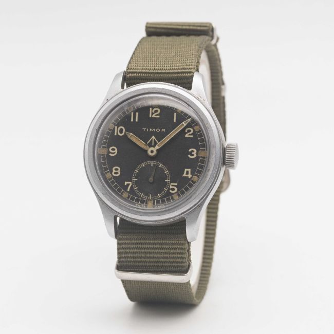 A GENTLEMAN'S STAINLESS STEEL BRITISH MILITARY TIMOR W.W.W. WRIST WATCHCIRCA 1945, PART OF THE "DIRTY DOZEN"Movement: 15J, manual wind, cal. 6060, signed Timor.Case: Diameter approx. 36mm, fixed bars, screw back, issue markings TIMOR ^ W.W.W. K 9489 39389, dust cover.Strap: NATO.CONDITION REPORTDial: Original dial in good condition, showing some signs of age.Movement: Running at present, timekeeping and accuracy cannot be guaranteed.Case: In very good condition, with light scratches due to use.Strap/Bracelet: In excellent condition.