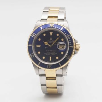 A GENTLEMAN'S STEEL & GOLD ROLEX OYSTER PERPETUAL DATE SUBMARINER BRACELET WATCHCIRCA 1989, REF. 16613 WITH BLUE-PURPLE DIALMovement: 31J automatic chronometer, quick-set date, cal. 3135, signed Montres Rolex S.A, numbered.Case: Diameter approx. 40mm, Oyster case, signed Montres Rolex S.A., L serial no., rotating gold bezel with 60 minute blue insert, sapphire crystal, Rolex triplock crown.Bracelet: Original steel & solid gold Rolex Oyster Submariner bracelet, numbered 93153.18/N9/401B.CONDITION REPORTDial: Original dial in excellent condition, showing a slight purple tint. Movement: Running & functioning at present, timekeeping and accuracy cannot be guaranteed.Case: In very good condition, with some small scratches due to general use.Strap/Bracelet: In excellent condition, with light scratches.