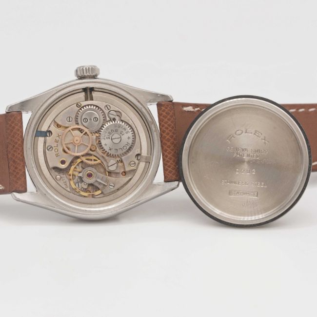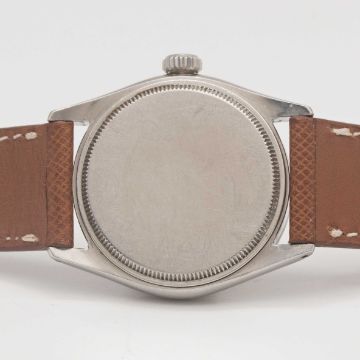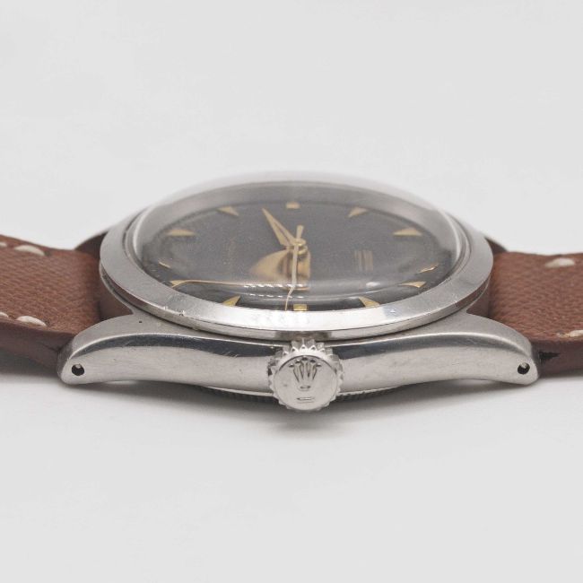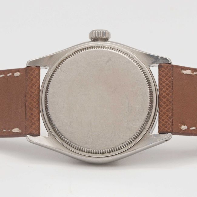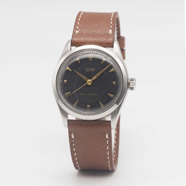 A RARE GENTLEMAN'S STAINLESS STEEL ROLEX OYSTER WRIST WATCHCIRCA 1953, REF. 6282 BLACK TEXTURED DIAL WITH GUILLOCHE CENTRE & "DAGGER" HANDSMovement: 15J, manual wind, cal. 710, signed Rolex, numbered.Case: Diameter approx. 34mm, Oyster case, signed Rolex, numbered 97x,xxx, Rolex Oyster crown.Strap: Leather.CONDITION REPORTDial: Original dial in very good condition, showing some signs of age to outer portion of dial.Movement: Running & functioning at present, timekeeping and accuracy cannot be guaranteed.Case: In very good condition, with light scratches due to general use.Strap/Bracelet: In excellent condition.