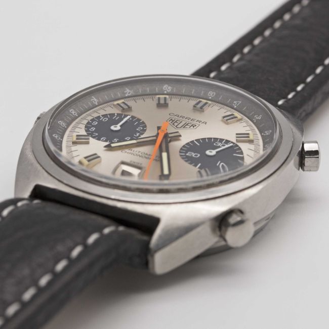 Case: Width approx. 38mm, screw back, signed Heuer-Leonidas SA, numbered 19x,xxx, Heuer crown & pushers.