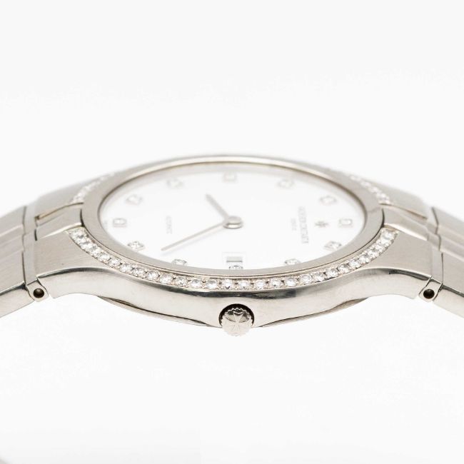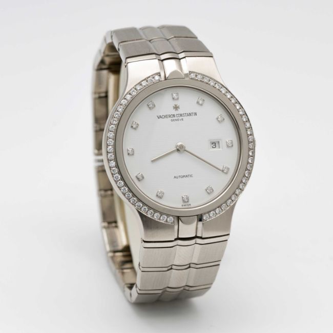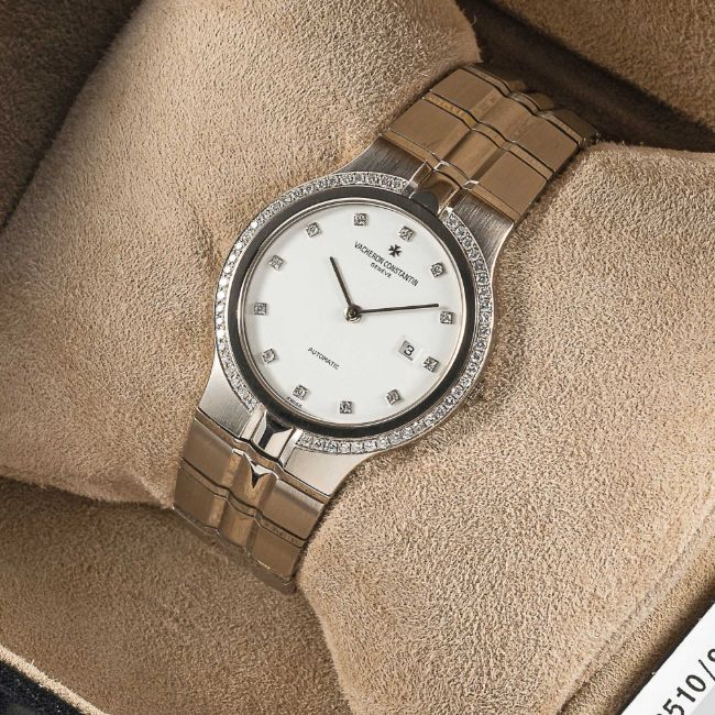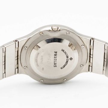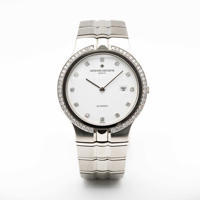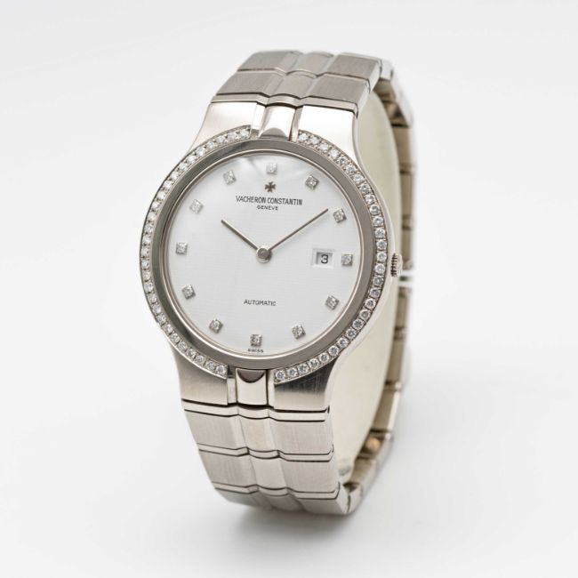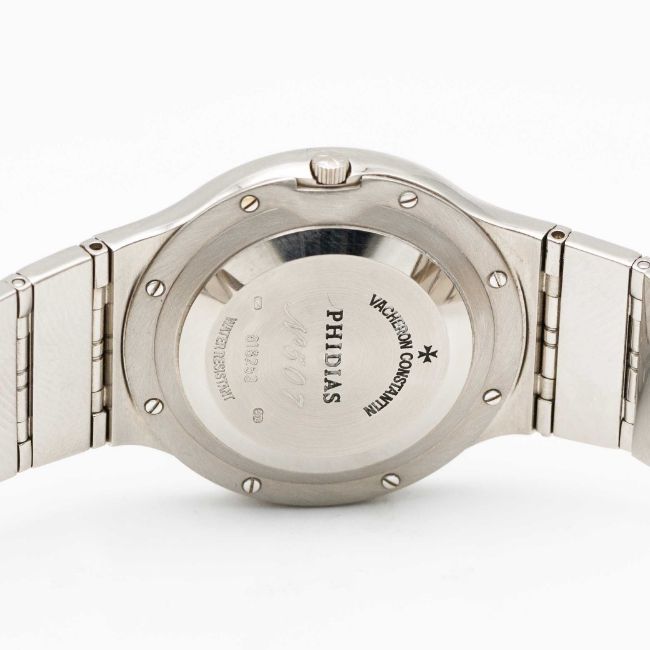 A FINE GENTLEMAN'S SIZE 18K SOLID WHITE GOLD & DIAMOND VACHERON CONSTANTIN PHIDIAS AUTOMATIC BRACELET WATCHCIRCA 1990s, REF. 48510/967JG, WHITE DIAL WITH DIAMOND SET HOUR MARKERS, ACCOMPANIED BY ORIGINAL BOX, TAG & BOOKLETMovement: Automatic, signed Vacheron Constantin, numbered.Case: Diameter approx. 33mm, signed Vacheron Constantin, numbered, 18k hallmarks, factory set diamond bezel, original crown.Bracelet: Original 18k solid white gold VC integral bracelet with concealed clasp.CONDITION REPORTDial: Original dial in excellent condition.Movement: Running & functioning at present, timekeeping and accuracy cannot be guaranteed.Case: In excellent condition, with some light scratches due to occasional use.Strap/Bracelet: In excellent condition with some light scratches.