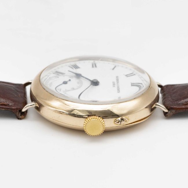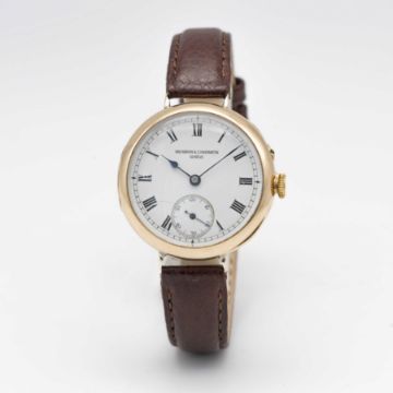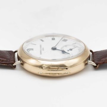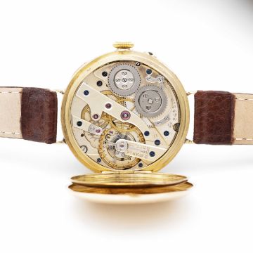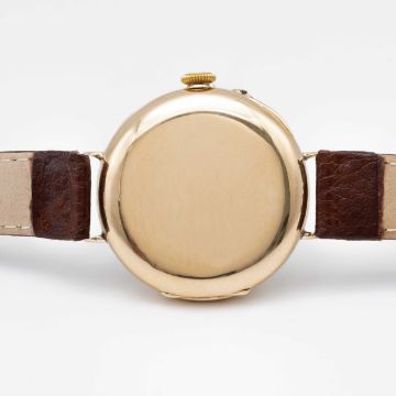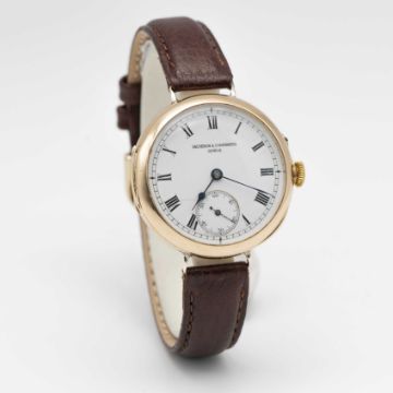 A GENTLEMAN'S EARLY 18K SOLID GOLD VACHERON & CONSTANTIN WRIST WATCHCIRCA 1915, WITH ENAMEL DIALMovement: Manual wind, signed with Vacheron & Constantin Maltese Cross symbol, numbered 34x,xxx. Case: Diameter approx. 28mm, hinged case, signed V&C with Maltese Cross symbol, numbered 20x,xxx, 18k Swiss hallmarks, inner cuvette signed "Examed by Goldsmiths & Silversmiths Company Ltd, 112 Regent St, London, Swiss Made".Strap: Leather.CONDITION REPORTDial: Original dial in good condition, with some hairline cracks to the enamel.Movement: Running & functioning at present, timekeeping and accuracy cannot be guaranteed.Case: In good condition, small signs of repair to wire lugs to be expected for this type of early wrist watch.Strap/Bracelet: In excellent condition.