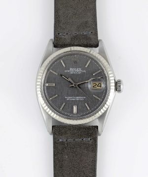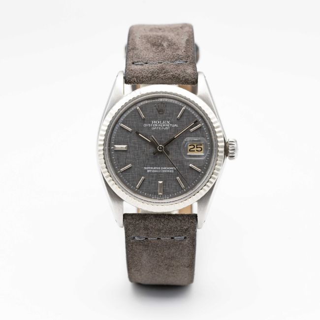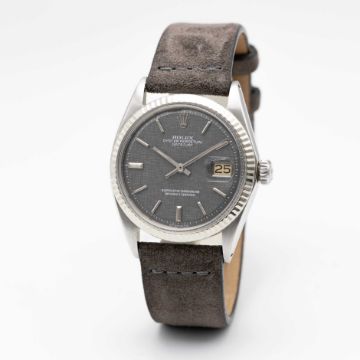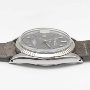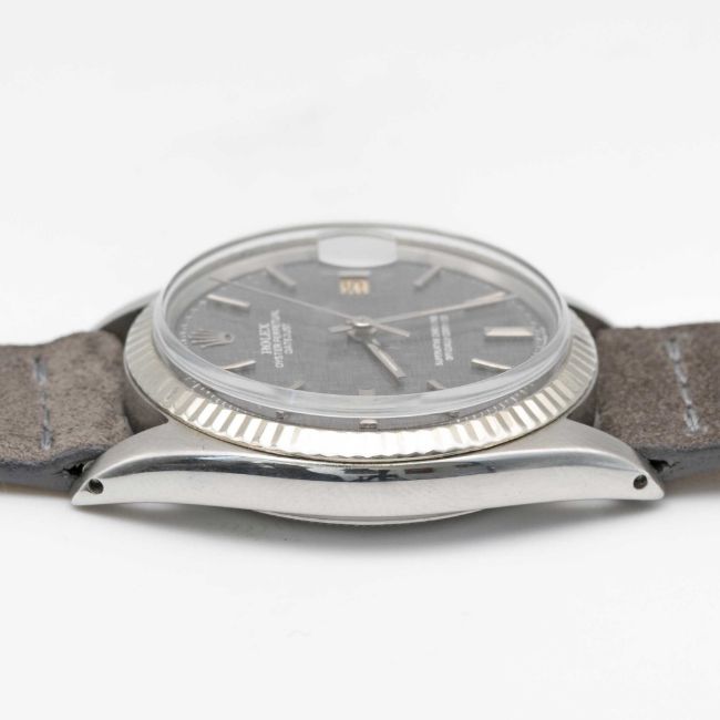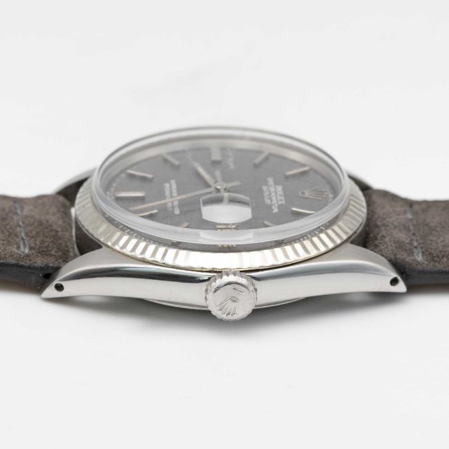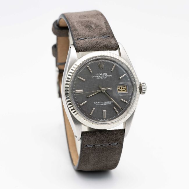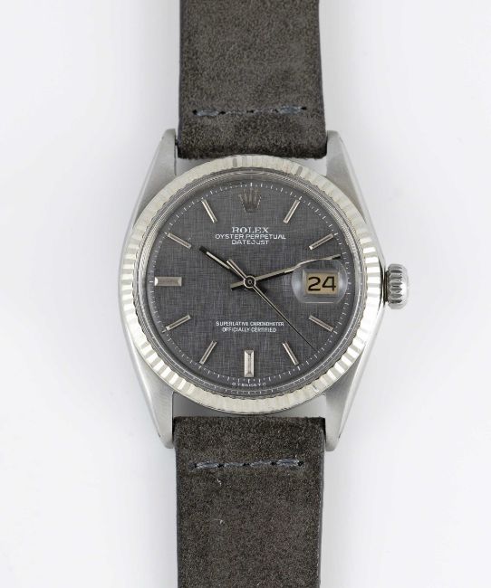 A GENTLEMAN'S STAINLESS STEEL ROLEX OYSTER PERPETUAL DATEJUST WRIST WATCHCIRCA 1970, REF. 1601 WITH 1603 CASE BACK, GREY "LINEN" SIGMA DIALMovement: 26J, automatic chronometer, cal. 1570, signed Rolex S.A. Geneva, numbered.Case: Diameter approx. 36mm, Oyster case, signed Montres Rolex S.A., serial no. 2.4xx,xxx, solid white gold fluted bezel, Rolex crown.Strap: Leather.CONDITION REPORTDial: Original dial in very good condition, showing some signs of age.Movement: Running & functioning at present, timekeeping and accuracy cannot be guaranteed.Case: In very good condition, with some light scratches due to general use.Strap/Bracelet: In excellent condition.