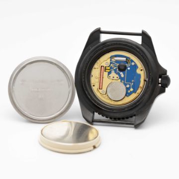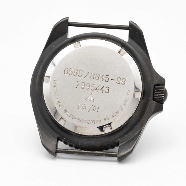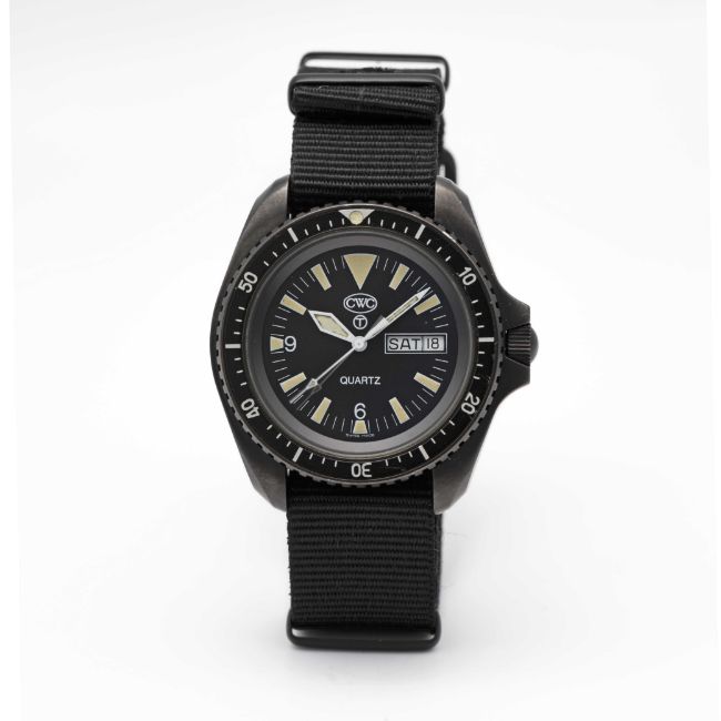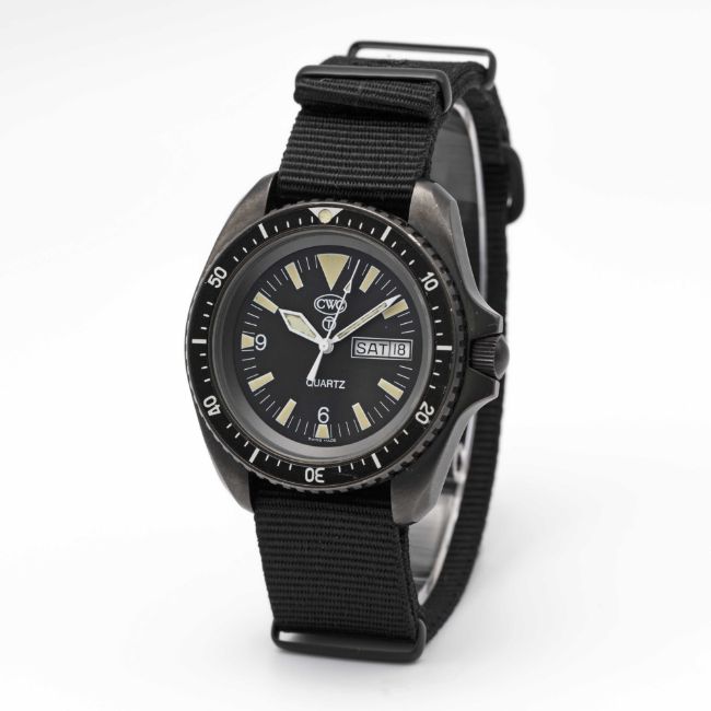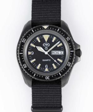 A GENTLEMAN'S PVD COATED BRITISH MILITARY CWC ROYAL NAVY SBS WRIST WATCHDATED 2001Movement: Quartz.Case: Diameter approx. 42mm, fixed bars, screw back, issue markings 0555/6645-99-7995443 ^ 413/01, 60 minute rotating bezel, screw-down crown.Strap: NATO.CONDITION REPORTDial: Original dial in excellent condition.Movement: Running & functioning at present, timekeeping and accuracy cannot be guaranteed.Case: In excellent condition, with some light scratches due to use.Strap/Bracelet: In excellent condition.