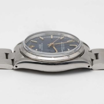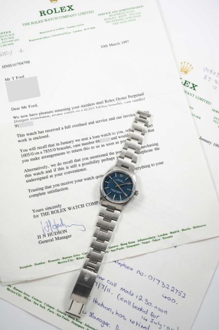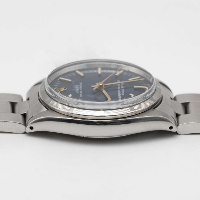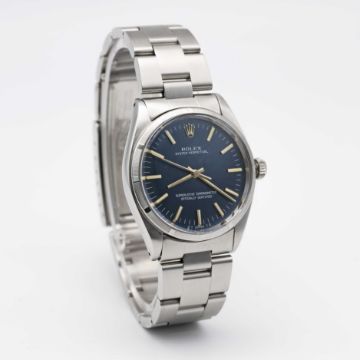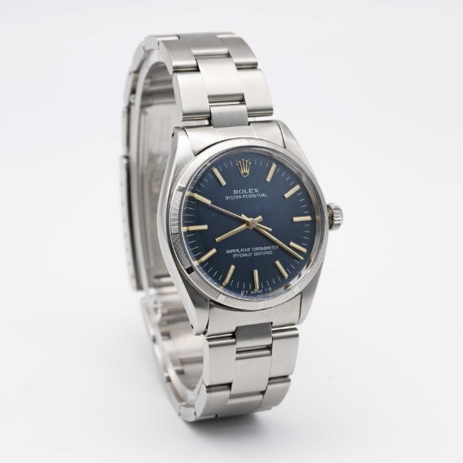 A GENTLEMAN'S STAINLESS STEEL ROLEX OYSTER PERPETUAL BRACELET WATCHCIRCA 1961, REF. 1003 WITH BRUSHED BLUE SIGMA DIAL, ACCOMPANIED BY ROLEX PAPERWORK BY GENERAL MANAGER AT THE TIME H. HUDSON, CONFIRMING THE WATCH AS A LOAN WATCH WHICH WAS EVENTUALLY PURCHASED BY THE CUSTOMER IN 1997Movement: 26J, automatic chronometer, cal. 1570, signed Montres Rolex S.A, numbered.Case: Diameter approx. 34.5mm, Oyster case, signed Montres Rolex S.A., dated III.60, numbered 663,xxx, milled bezel, Rolex crown.Bracelet: Rolex Oyster bracelet, numbered 78350 V12 / 557B.CONDITION REPORTDial: Original dial from early 1970s in very good condition, most likely fitted by Rolex prior to being used as a loan watch, showing some small signs of age.Movement: Running & functioning at present, timekeeping and accuracy cannot be guaranteed.Case: In very good condition, with some light wear due to general use.Bracelet: In excellent condition with some small scratches due to general use.