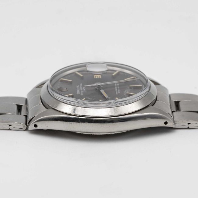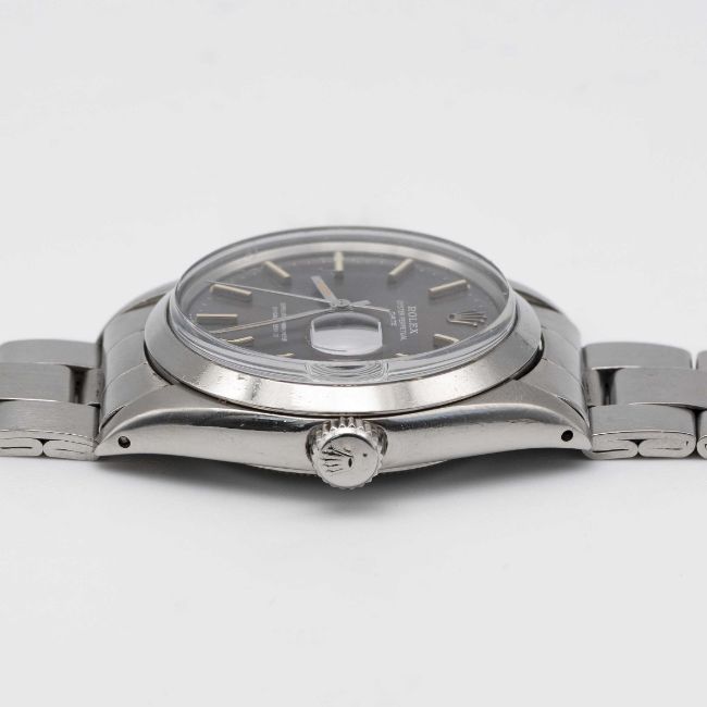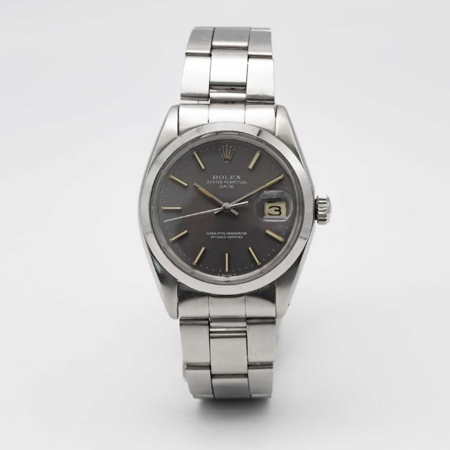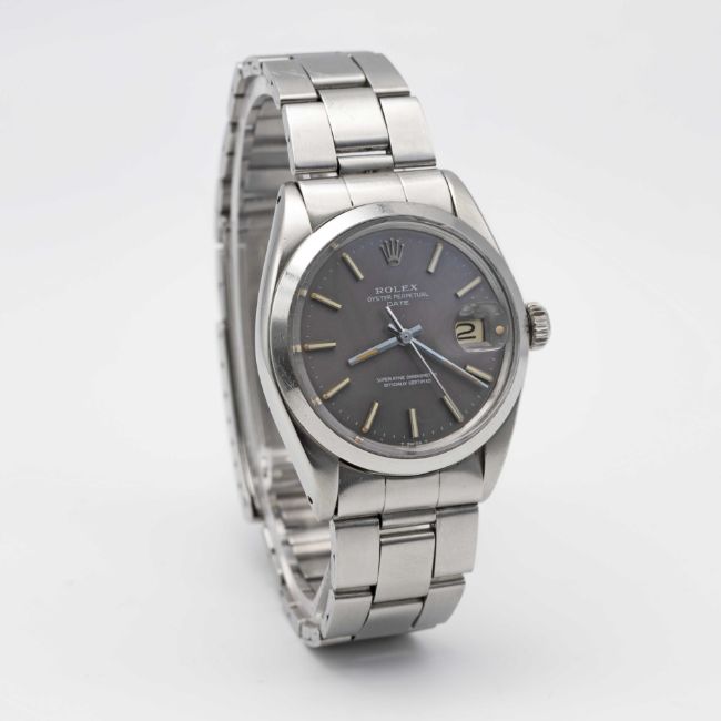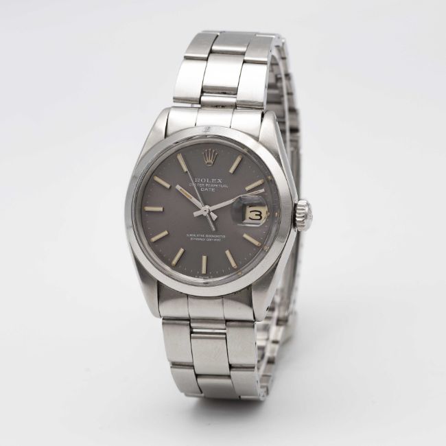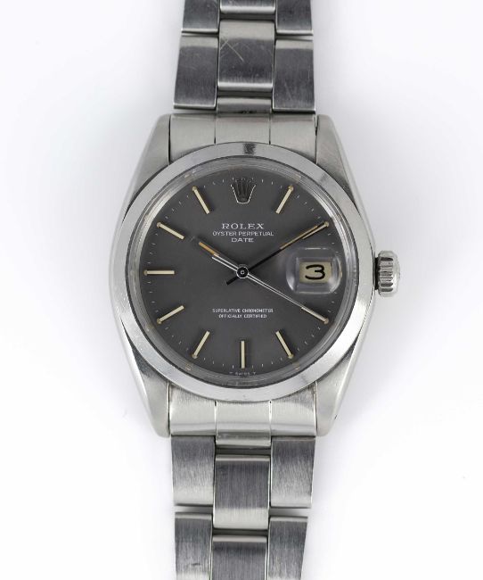 A GENTLEMAN'S STAINLESS STEEL ROLEX OYSTER PERPETUAL DATE BRACELET WATCHCIRCA 1969, REF. 1500 WITH GREY DIAL TURNING PURPLEMovement: 26J, automatic chronometer, cal. 1570, signed Montres Rolex S.A., numbered.Case: Diameter approx. 34.5mm, Oyster case, signed Montres Rolex S.A., dated IV.68, serial no. 2,1xx,xxx, Rolex crown.Bracelet: Rolex Oyster bracelet, numbered 7835/19/357.CONDITION REPORTDial: Original dial in very good condition with some signs of age. Movement: Running at present.Case: In good condition, with some scratches and wear due to general use. Strap/Bracelet: In good condition, with light scratches & wear due to general use.