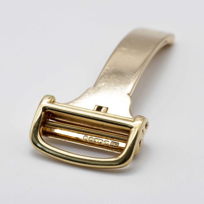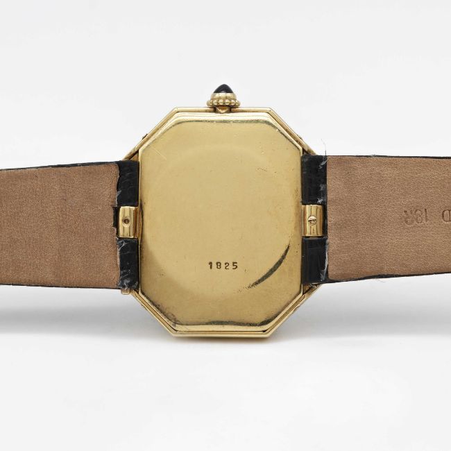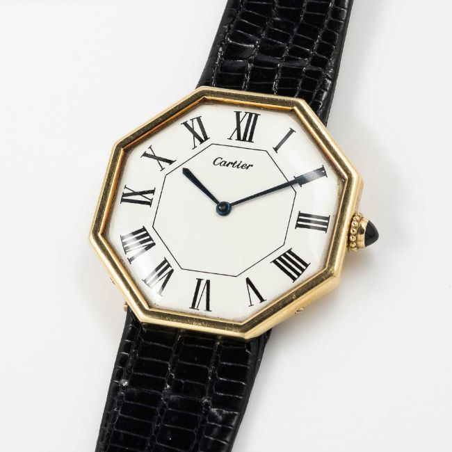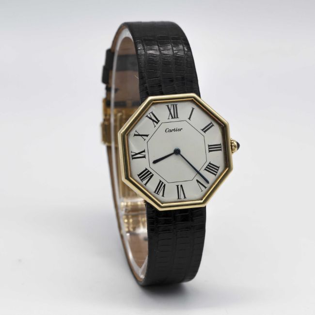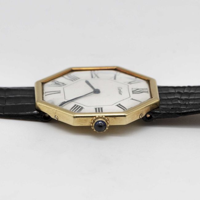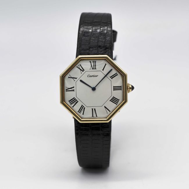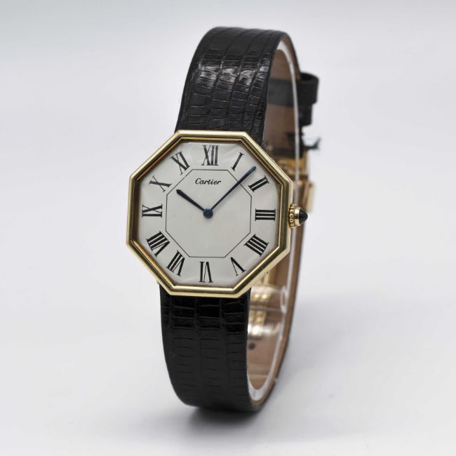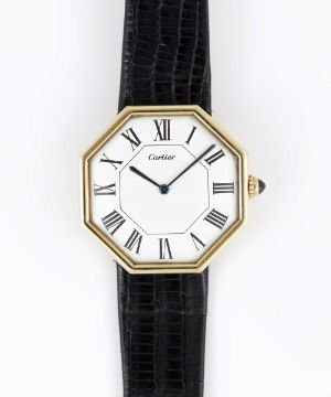 A VERY RARE GENTLEMAN'S LARGE SIZE 18K SOLID GOLD CARTIER LONDON OCTAGONAL WRIST WATCHCIRCA 1976, WITH LONDON HALLMARKSMovement: Manual wind, signed Jaeger-LeCoultre, cal. P838, numbered 2,08x,xxx, Case: Width approx. 33mm, numbered, 18k London hallmarks with letter (B), sapphire crown.Strap: Black leather strap with original 18k solid gold deployment clasp with London hallmarks with letter (B), matching numbers on clasp & case.CONDITION REPORTDial: Original dial in excellent condition, showing some small signs of age.Movement: Running & functioning at present, timekeeping and accuracy cannot be guaranteed.Case: In excellent condition, with some light scratches due to general use.Strap: In excellent condition. Watch sold with stainless steel deployment attached and original Cartier deployment included separately.