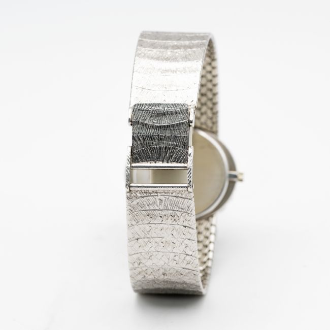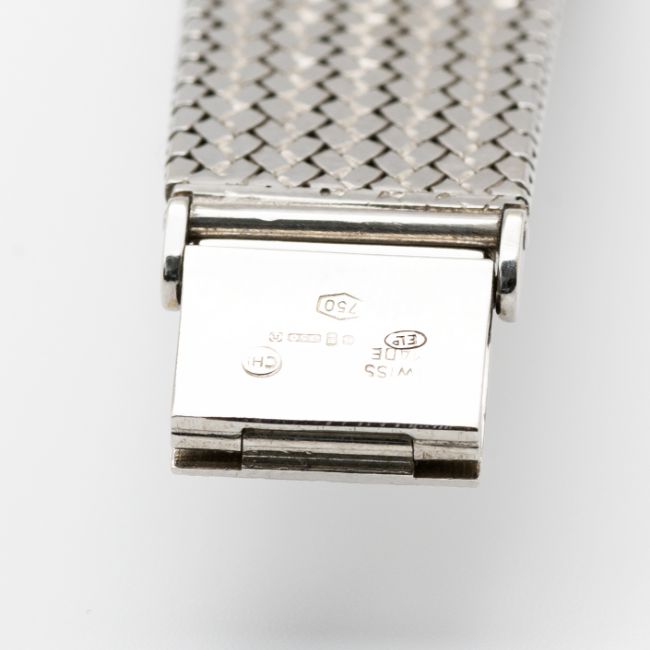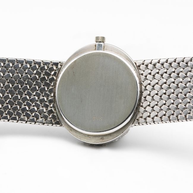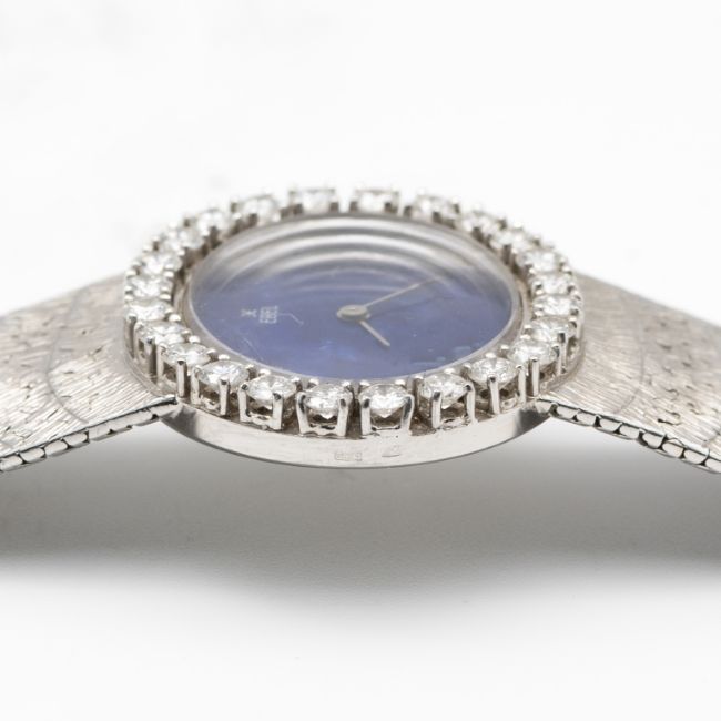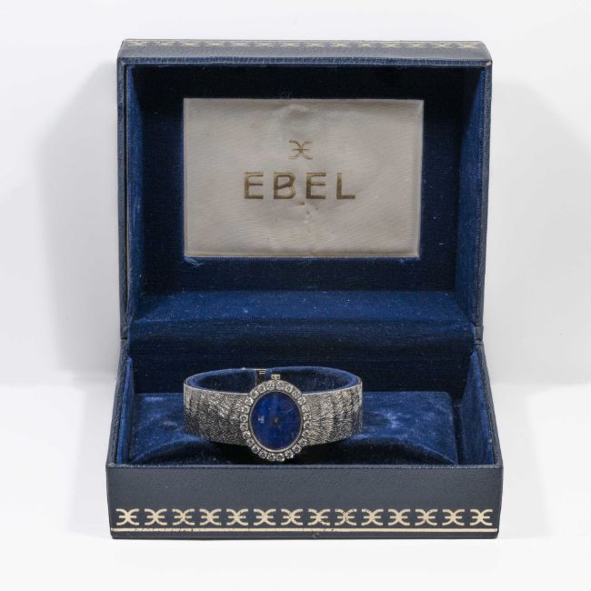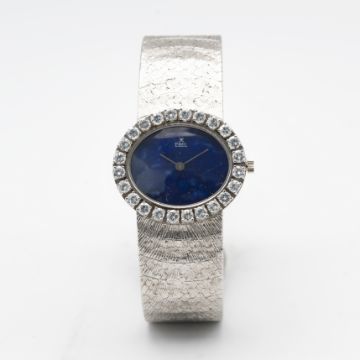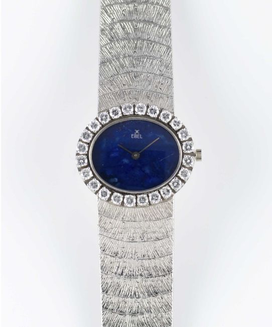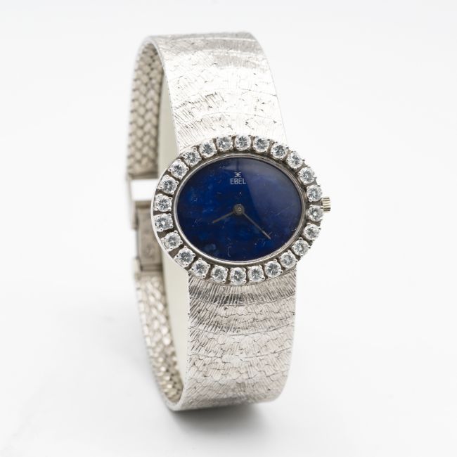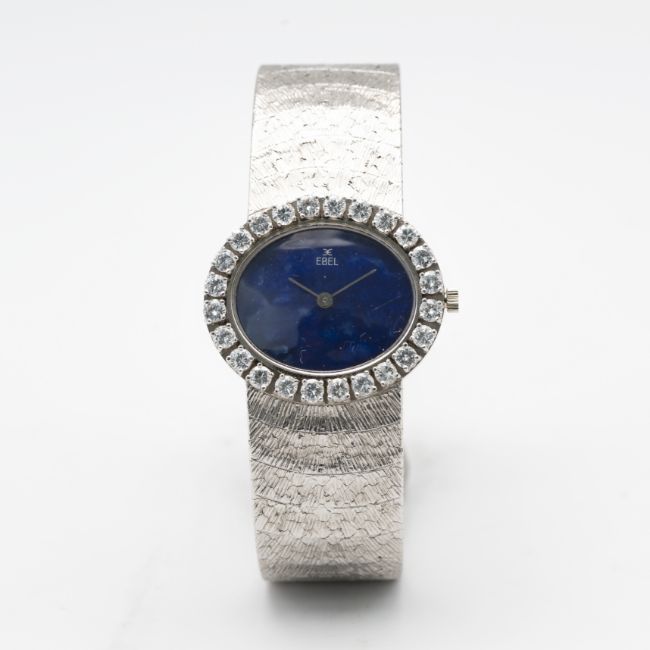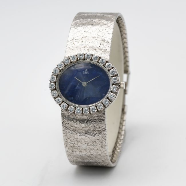 A LADIES FINE 18K SOLID WHITE GOLD & DIAMOND EBEL BRACELET WATCHCIRCA 1970s, WITH LAPIS DIAL, ACCOMPANIED BY EBEL BOXMovement: 18J, manual wind, cal. 96, signed Ebel, numbered.Case: Width approx. 28mm, snap back, numbered 896,xxx, 18k hallmarks, original factory set diamond bezel.Bracelet: Original 18k solid white gold integral bracelet.CONDITION REPORTDial: Original dial in excellent condition.Movement: Running & functioning at present, timekeeping and accuracy cannot be guaranteed.Case: In excellent condition.Strap/Bracelet: In excellent condition.