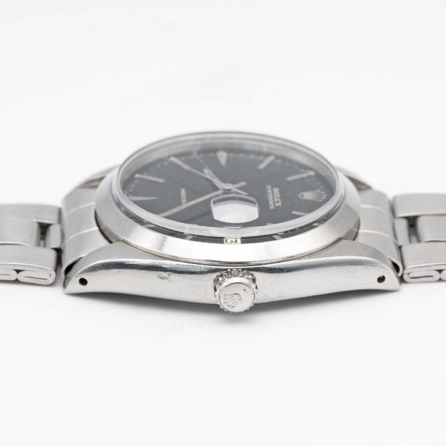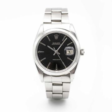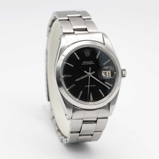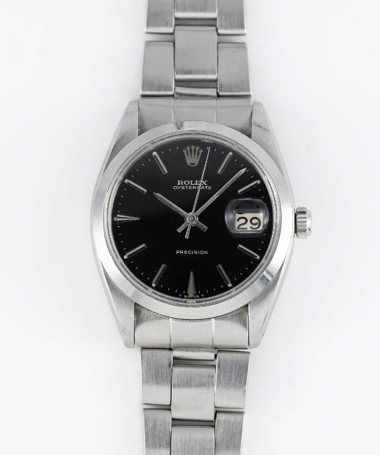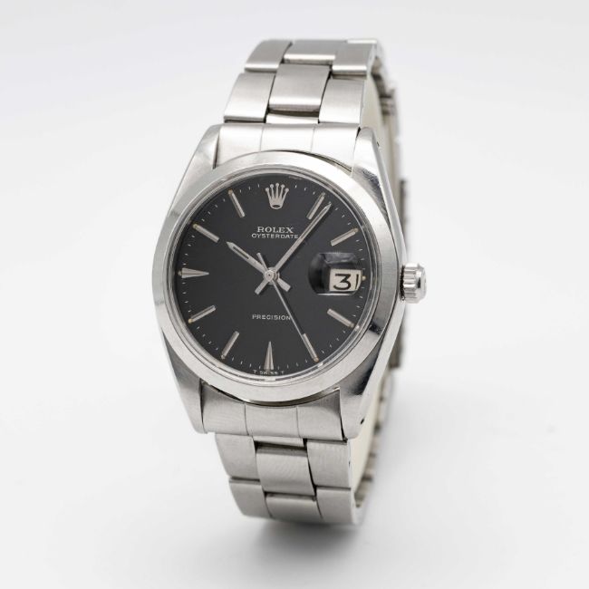 A GENTLEMAN'S STAINLESS STEEL ROLEX OYSTERDATE PRECISION BRACELET WATCHCIRCA 1966, REF. 6694 WITH GLOSS BLACK GILT DIALMovement: 17J, manual wind, cal. 1215, signed Montres Rolex S.A, numbered.Case: Diameter approx. 35mm, Oyster case, signed Montres Rolex S.A., dated II.66, numbered 1,4xx,xxx, Rolex crown.Bracelet: Rolex Oyster bracelet, numbered 7835/19/357.CONDITION REPORTDial: Original dial in excellent condition, showing small signs of age.Movement: Running & functioning at present, timekeeping and accuracy cannot be guaranteed.Case: In very good condition, with small scratches due to general use.Strap/Bracelet: In good condition, with light scratches & some wear due to general use.