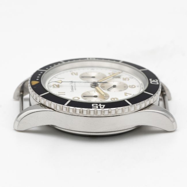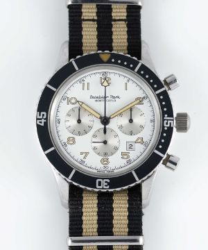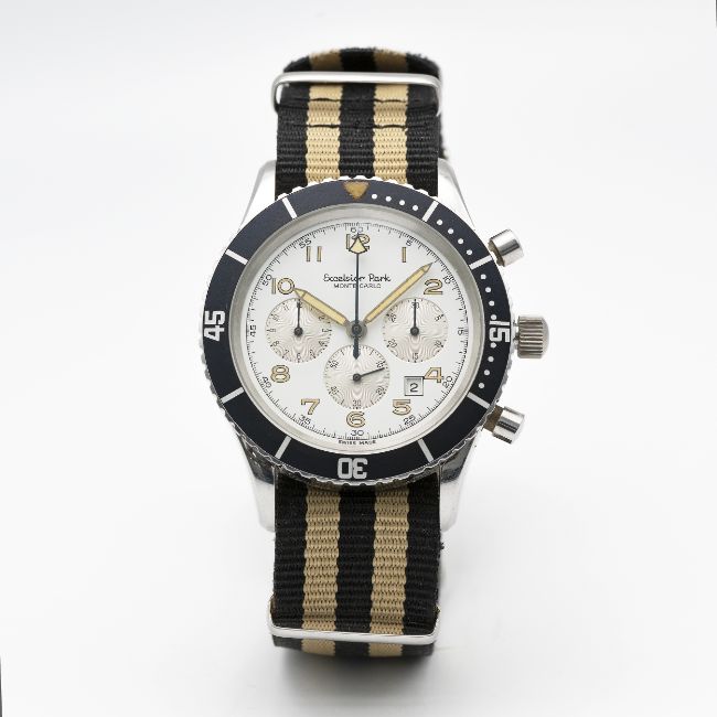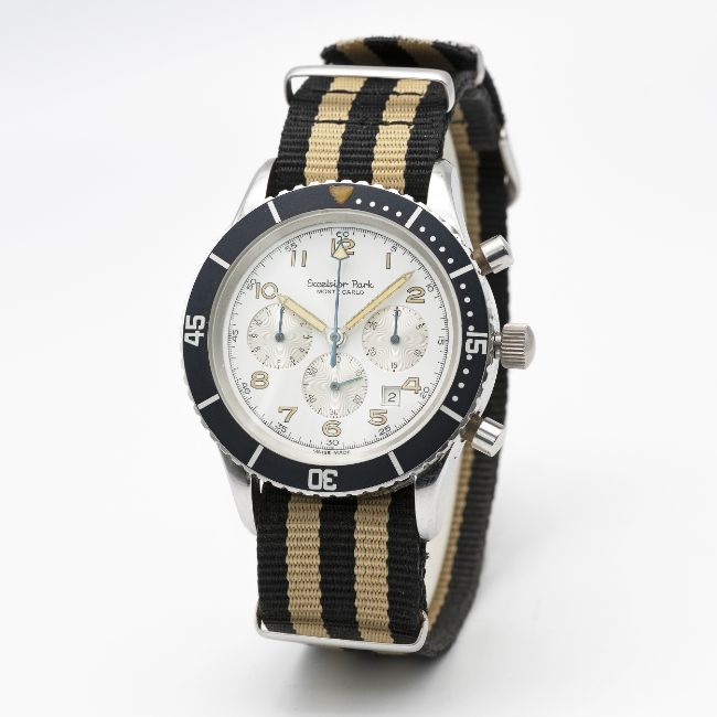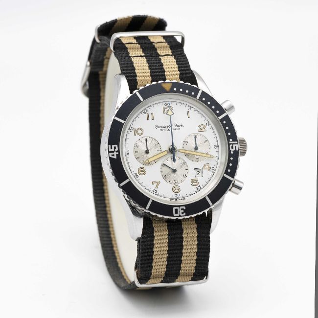 A RARE GENTLEMAN'S STAINLESS STEEL EXCELSIOR PARK MONTE CARLO CHRONOGRAPH WRIST WATCHCIRCA 1980s, REF. 7740 Movement: 17J, manual wind, Valjoux cal. 7740.Case: Diameter approx. 43mm, screw back, signed signed Excelsior Park, rotating 60 minute bezel.Strap: NATO.CONDITION REPORTDial: Original dial in excellent condition.Movement: Running & functioning at present, timekeeping and accuracy cannot be guaranteed.Case: In excellent condition, with some light scratches due to general use.Strap/Bracelet: In excellent condition.