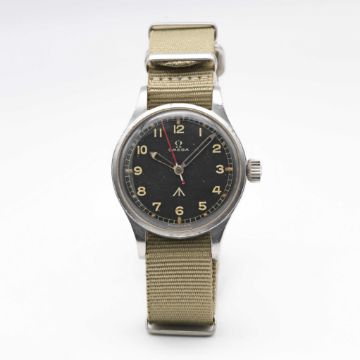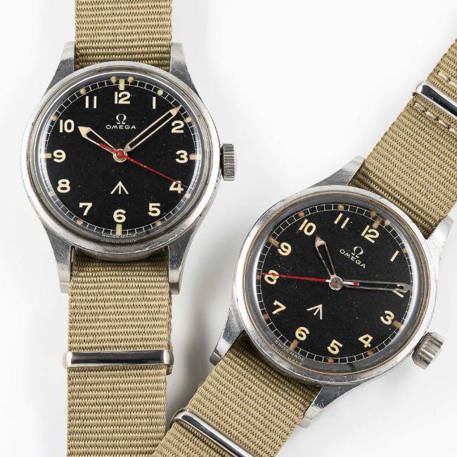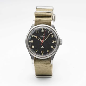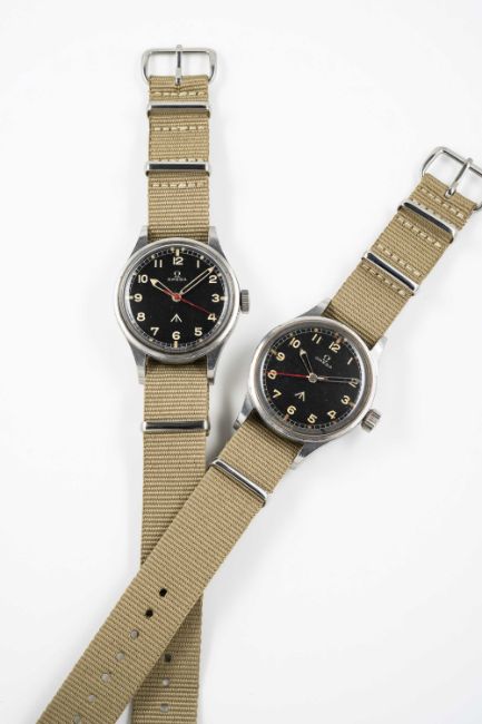 A SET OF TWO VERY RARE GENTLEMAN'S STAINLESS STEEL BRITISH MILITARY OMEGA RAF PILOTS WRIST WATCHESCIRCA 1950s, REF. 2777-1 SC REISSUED TO THE ROYAL RHODESIAN AIR FORCE WITH CONSECUTIVE ISSUE MARKINGS 005 & 006, BOTH WITH ORIGINAL THIN ARROW DIALS AND RED CENTRE SECOND HANDSA GENTLEMAN'S STAINLESS STEEL BRITISH MILITARY OMEGA WRIST WATCHMovement: 17J, manual wind, cal. 283, signed Omega, numbered, 14,1xx,xxx.Case: Diameter approx. 37mm, fixed bars, screw back, signed Omega Watch Co, issue markings . ^ 6645 101000  R.R.A.F. 005  6B/542, dust cover, omega crown.Strap: NATO.A GENTLEMAN'S STAINLESS STEEL BRITISH MILITARY OMEGA WRIST WATCHMovement: 17J, manual wind, cal. 283, signed Omega, numbered, 14,8xx,xxx.Case: Diameter approx. 37mm, fixed bars, screw back, signed Omega Watch Co, issue markings . ^ 6645 101000  R.R.A.F. 006  6B/542, dust cover.Strap: NATO.CONDITION REPORT (Omega 005)Dial: Original dial in good condition, showing signs of age.Movement: Running & functioning at present, timekeeping and accuracy cannot be guaranteed.Case: In good condition, with scratches and light wear due to use, dust cover ring.Strap: In excellent condition(Omega 006)Dial: Original dial in very good condition, showing some signs of age.Movement: Running & functioning at present, timekeeping and accuracy cannot be guaranteed.Case: In good condition, with scratches and light wear due to use, dust cover ring.Strap: In excellent condition.