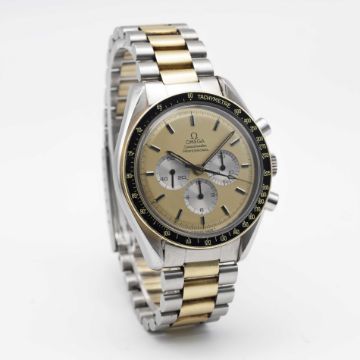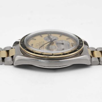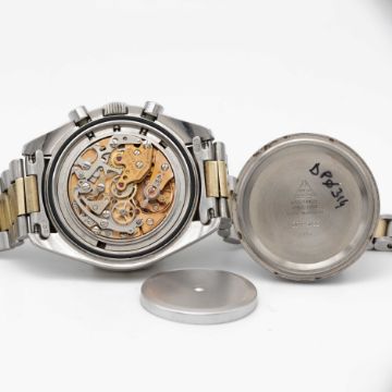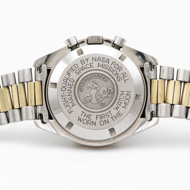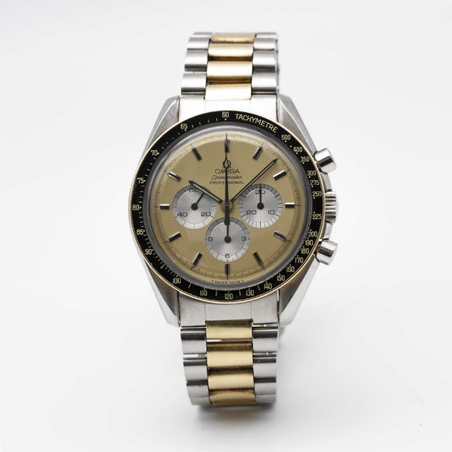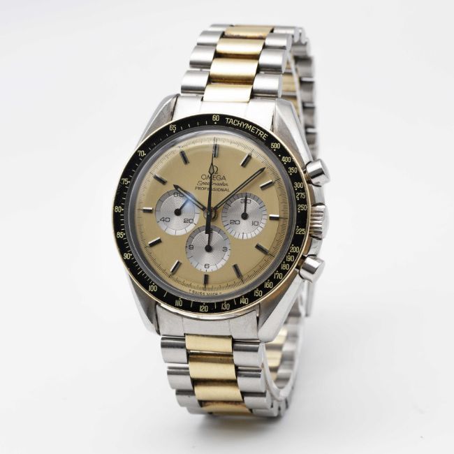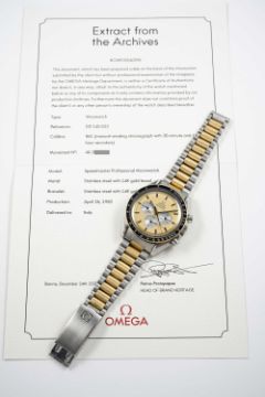 A RARE GENTLEMAN'S STEEL & GOLD OMEGA SPEEDMASTER PROFESSIONAL CHRONOGRAPH BRACELET WATCHDATED 1982, REF. DD145.022 THE FIRST STEEL & GOLD SPEEDMASTER MODEL PRODUCED, ACCOMPANIED BY OMEGA EXTRACT FROM THE ARCHIVES SHOWING DELIVERY TO ITALYMovement: 17J, manual wind, cal. 861, signed Omega, numbered 45,xxx,xxx.Case: Diameter approx. 42mm, screw back, Speedmaster emblem embossed with NASA moon landing tribute, signed Omega Watch Co. C.R.S., solid gold bezel with tachymetre insert, Omega crown.Bracelet: Original Omega Speedmaster steel & gold bracelet, numbered (11) 1171/633.CONDITION REPORTDial: Original dial in excellent condition.Movement: Running & functioning at present, timekeeping and accuracy cannot be guaranteed.Case: In very good condition, with small scratches due to general use.Strap/Bracelet: In very good condition, with some light scratches due to general use.