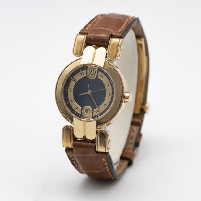 A LADIES 18K SOLID GOLD HARRY WINSTON PREMIER WRIST WATCHCIRCA 1990s,  REF. LQ 27 GL Movement: Quartz, signed & numbered.Case: Diameter approx. 27mm, snap back, signed Harry Winston,18k hallmarks, numbered, original crown.Strap: Original leather strap with 18k solid gold Harry Winston deployment clasp.CONDITION REPORTDial: Original dial in excellent condition.Movement: Running & functioning at present, timekeeping and accuracy cannot be guaranteed.Case: In excellent condition, with some light scratches due to general use.Strap/Bracelet: In excellent condition.