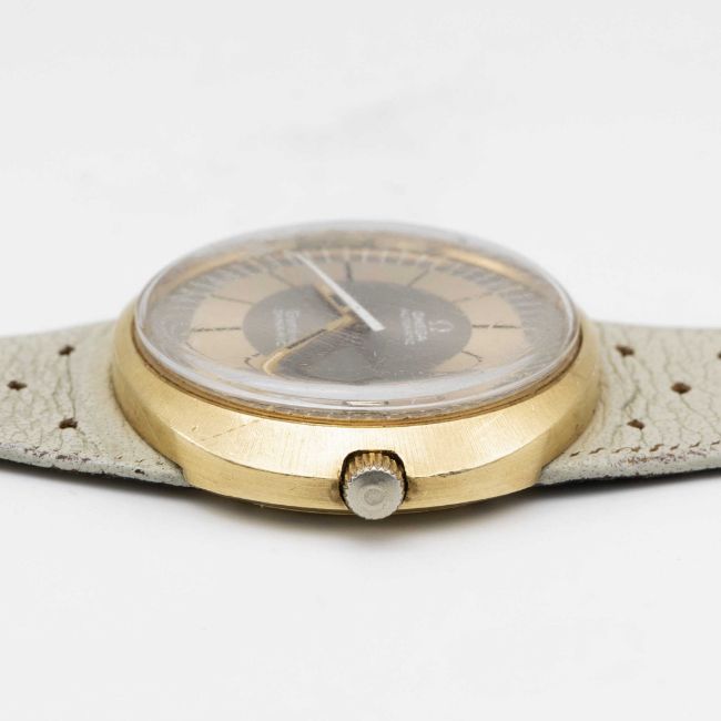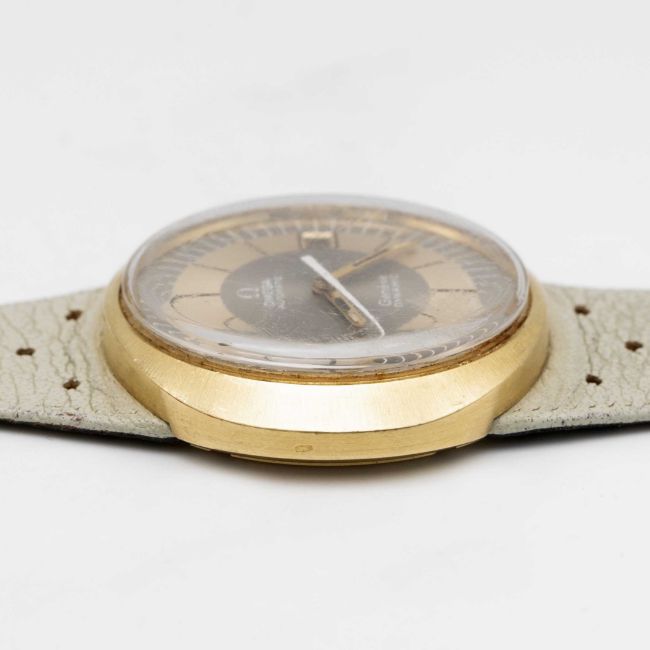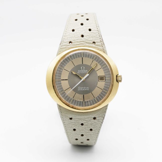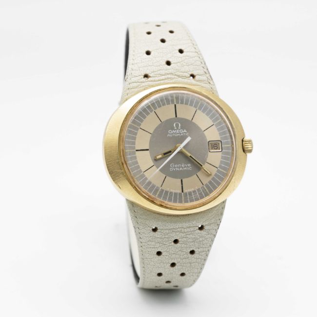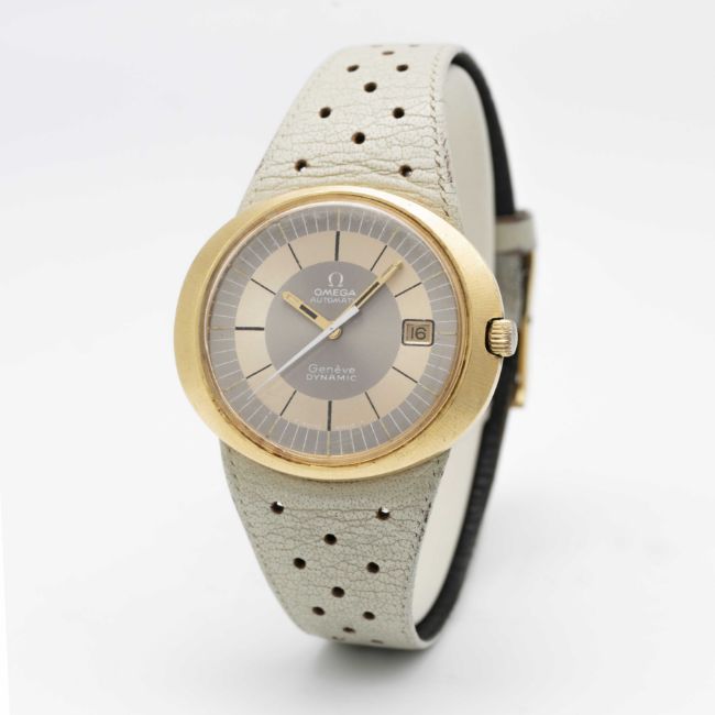 A RARE GENTLEMAN'S 18K SOLID GOLD OMEGA GENEVE DYNAMIC AUTOMATIC WRIST WATCHCIRCA 1970sMovement: Automatic, signed Omega, numbered.Case: Width approx. 41mm,  signed Omega Watch Co, 18k hallmarks, Omega crown.Strap: Original Omega perforated leather strap & gold plated Omega pin buckle.CONDITION REPORTDial: Original dial in very good condition, showing some small signs of age.Movement: Running & functioning at present, timekeeping and accuracy cannot be guaranteed.Case: In very good condition, with some small scratches due to general use, wear to the crown.Strap: In fair condition, showing signs of use, some light wear to the plated buckle.