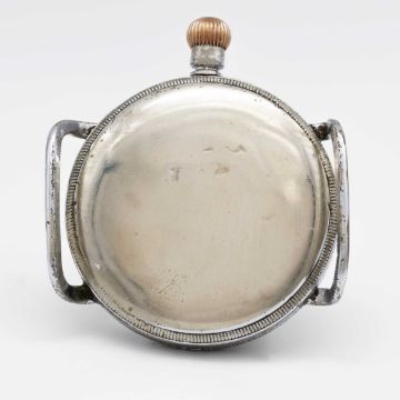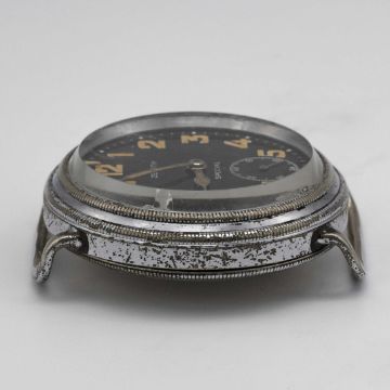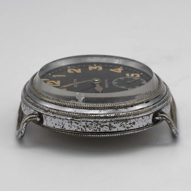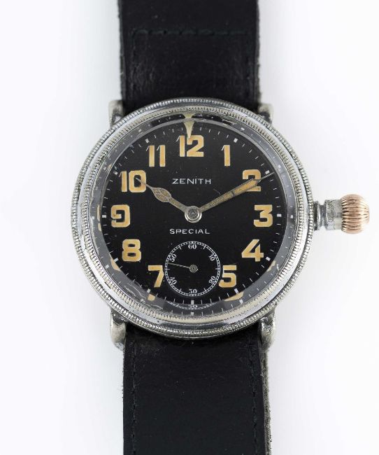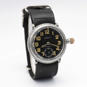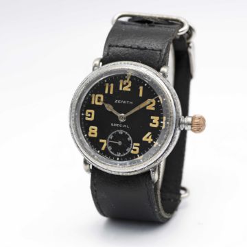 A GENTLEMAN'S ZENITH SPECIAL PILOTS WRIST WATCHCIRCA 1930, WITH BLACK ENAMEL DIALMovement: Manual wind, swan neck regulator, signed Zenith, numbered 3,0xx,xxx.Case: Diameter approx. 40.5mm, nickel plated, screw top & back, numbered 8,1xx,xxx, clear movement cover, rotating inner pointer, "onion" crown.Strap: Leather NATO.CONDITION REPORTDial: Original dial in fair condition, fine hairline crack to edge between 10 & 11 o'clock positions & leading to the centre.Movement: Running & functioning at present, timekeeping and accuracy cannot be guaranteed.Case: In fair condition, showing signs of wear, and with scratches due to use.Strap/Bracelet: In good condition.