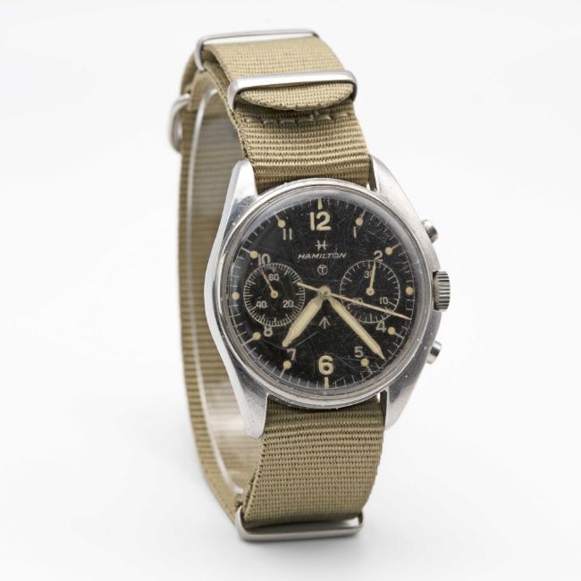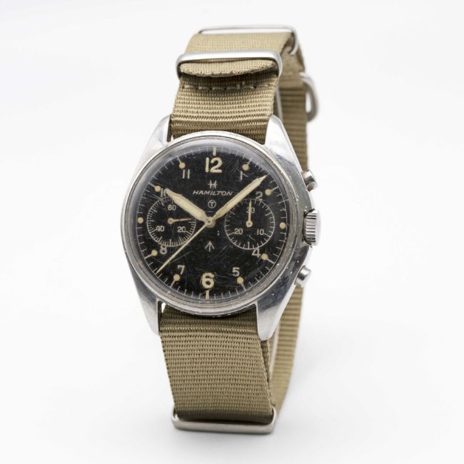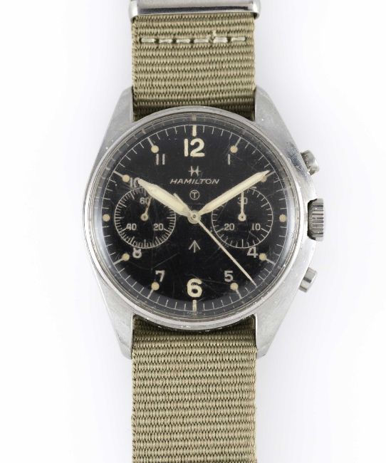 A GENTLEMAN'S STAINLESS STEEL BRITISH MILITARY ROYAL NAVY HAMILTON PILOTS CHRONOGRAPH WRIST WATCHDATED 1970, PART OF THE "FAB FOUR"Movement: 17J, manual wind, Valjoux cal. 7733, signed HamiltonCase: Diameter approx. 39mm, fixed bars, screw back, numbered 1,3xx,xxx, issue markings 6BB/6645-99-924-3306 ^ A/434/70. Strap: NATO.CONDITION REPORTDial: Original dial in very good condition, showing some small signs of age.Movement: Running & functioning at present, timekeeping and accuracy cannot be guaranteed.Case: In good condition, with some light scratches due to use.Strap: In excellent condition.