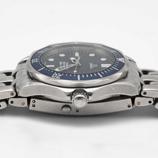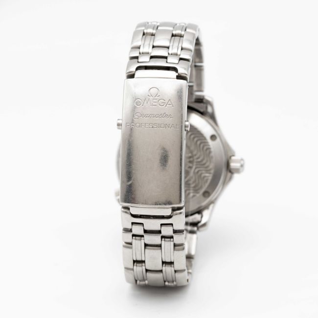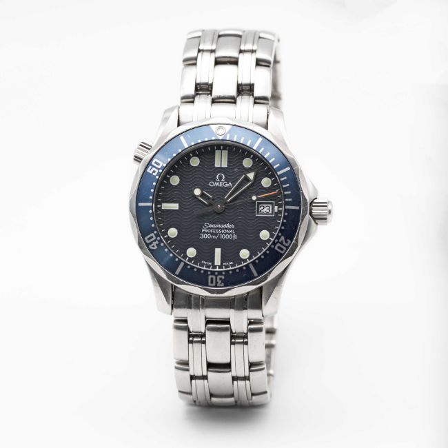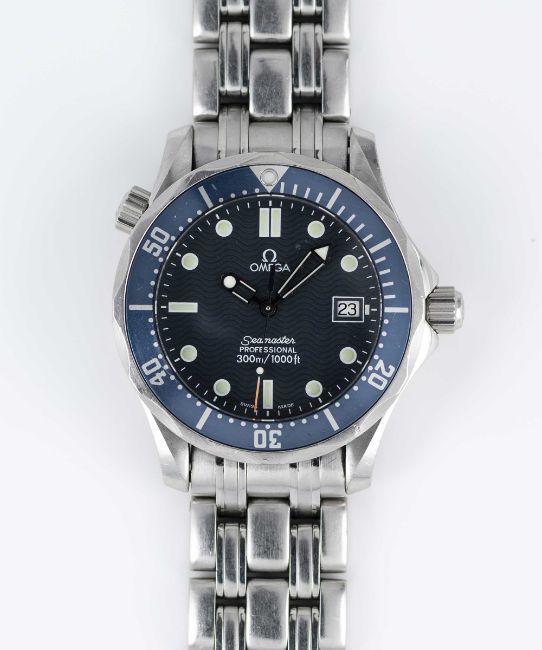 A MIDSIZE OMEGA SEAMASTER PROFESSIONAL 300M QUARTZ BRACELET WATCHCIRCA 1990s, REF 2551.80.00 WITH BLUE "WAVE" DIALMovement: Quartz, signed Omega, numbered.Case: Diameter approx. 36mm, screw back, Seamaster emblem embossed on case back, signed Omega Watch Co, numbered 57,xxx,xxx, blue 60 minute rotating bezel, helium escape valve, Omega crowns.Bracelet: Original Omega Seamaster Professional bracelet, numbered (No. 32) 1502/824.CONDITION REPORTDial: Original dial in excellent condition.Movement: Running & functioning at present, timekeeping and accuracy cannot be guaranteed.Case: In good condition, with some small scratches mainly around the bezel due to general use.Strap/Bracelet: In good condition, with light scratches & wear due to general use.