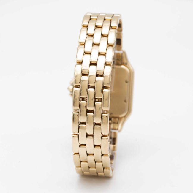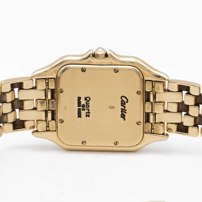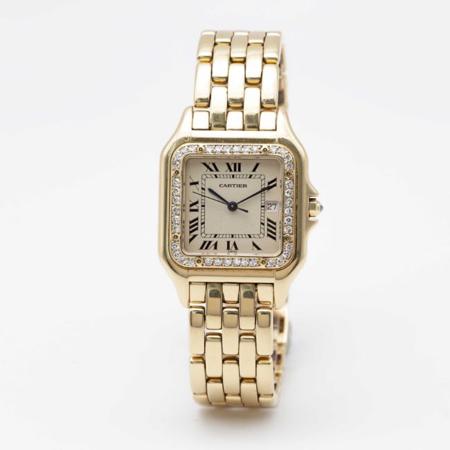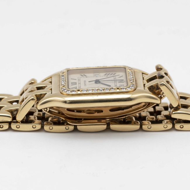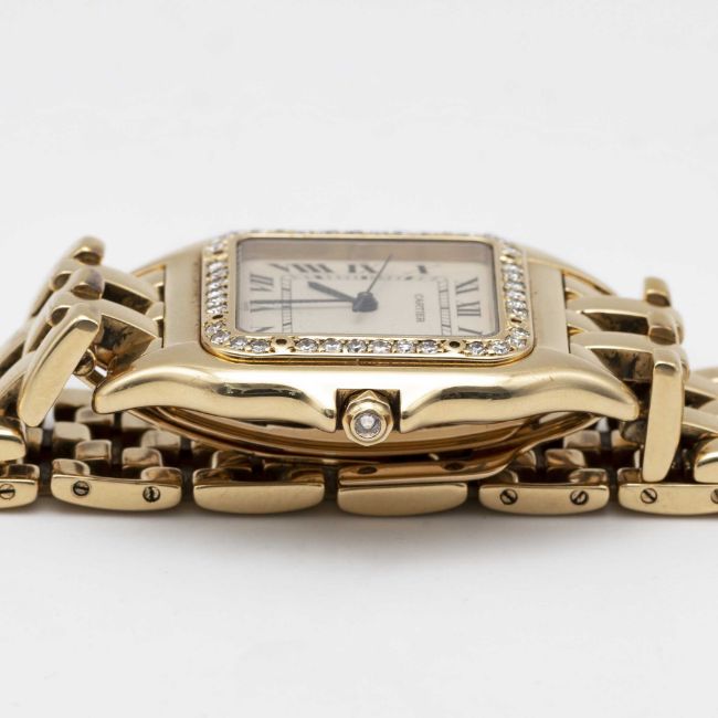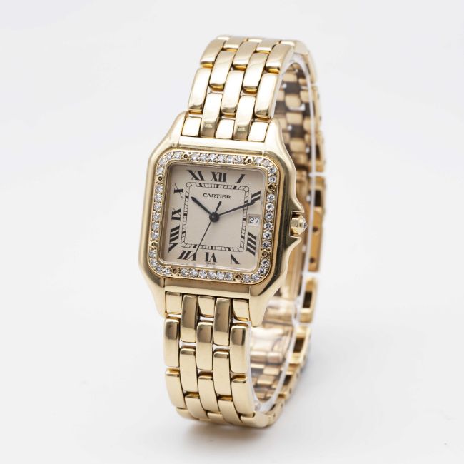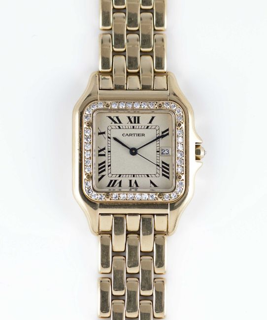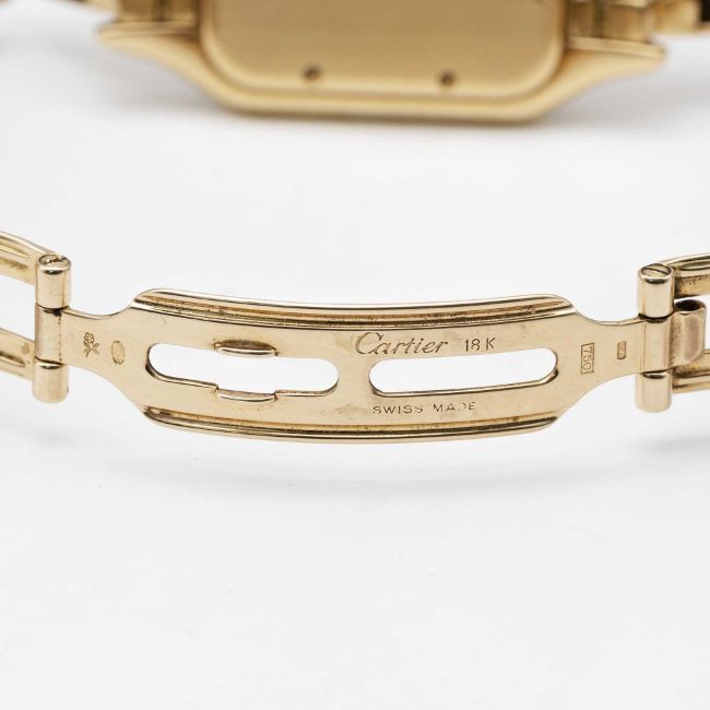 A LARGE SIZE 18K SOLID GOLD CARTIER PANTHERE BRACELET WATCHCIRCA 1990s, REF. 8839 WITH AFTER SET DIAMOND BEZELMovement: Quartz, signed Cartier.Case: Case size 39.5mm by 29.5mm, signed Cartier, numbered, 18K hallmarks, after set diamond bezel and diamond crown.Bracelet: Original Cartier Panthere 18K solid gold bracelet, total length approx.186mm.CONDITION REPORTDial: Original dial in excellent condition, showing some small signs of age.Movement: Running & functioning at present, timekeeping and accuracy cannot be guaranteed.Case: In very good condition, with some light scratches due to general use.Bracelet: In excellent condition with light scratches due to general use.