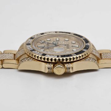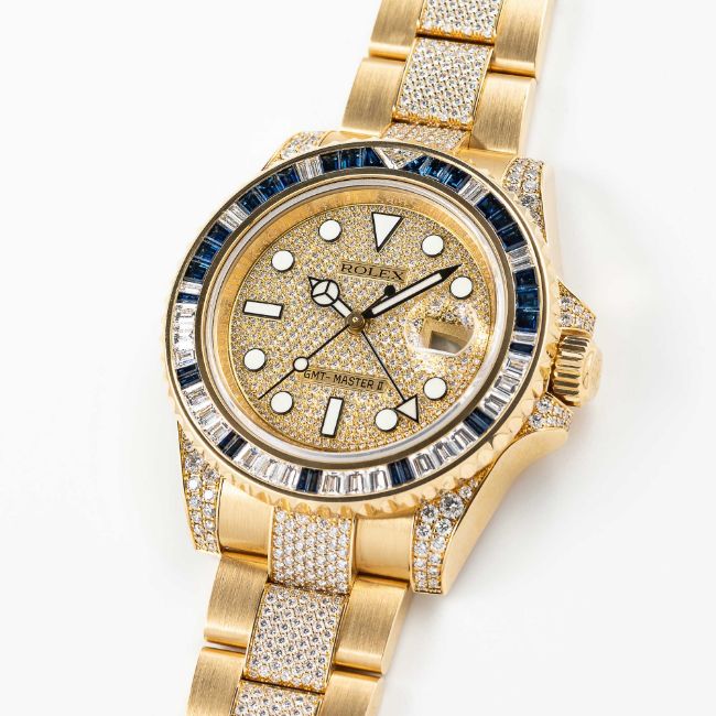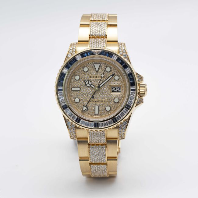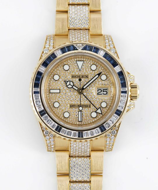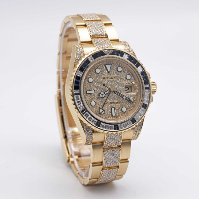 A FINE & RARE 18K SOLID YELLOW GOLD, DIAMOND & SAPPHIRE ROLEX OYSTER PERPETUAL DATE GMT MASTER II BRACELET WATCHDATED 2008, REF. 116758SANR COMPLETE FACTORY SET DIAMONDS & SAPPHIRES, ORIGINAL PAVÉ SET DIAMOND DIAL, ACCOMPANIED BY ORIGINAL BOX, GUARANTEE CARD & ROLEX SERVICE QUOTATION PAPERWORKMovement: Automatic chronometer, quick-set date, signed Rolex S.A, numbered.Case: Diameter approx. 40mm, Oyster case, signed Rolex S.A., M serial no., factory set blue sapphire and diamond bezel, factory set diamond lugs & crown guards, sapphire crystal, Rolex triplock crown.Bracelet: Original Rolex Oyster 18k solid gold bracelet with factory set diamonds, flip lock clasp numbered PJ11.CONDITION REPORTDial: Original dial in excellent condition.Movement: Running & functioning at present, timekeeping and accuracy cannot be guaranteed.Case: In excellent condition, with some light scratches due to general use.Strap/Bracelet: In excellent condition.