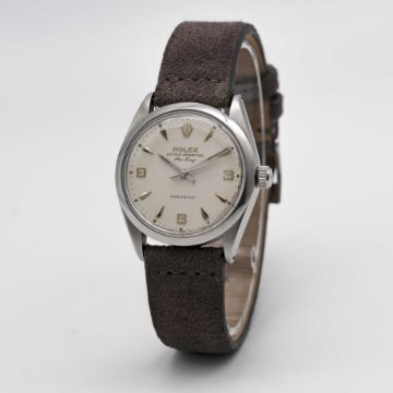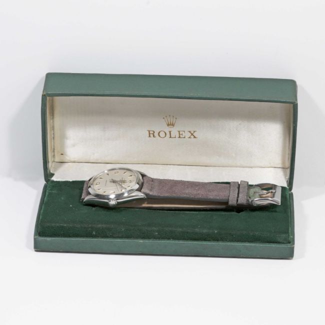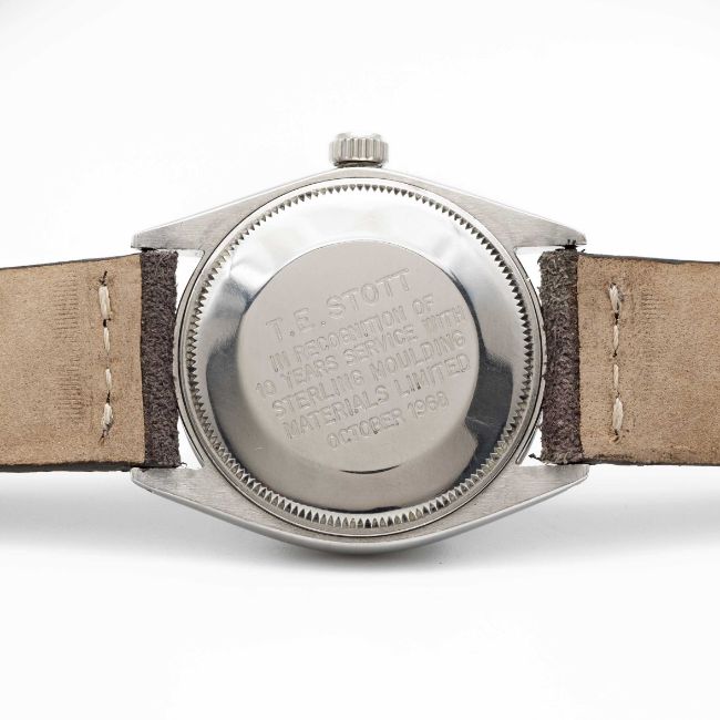A GENTLEMAN'S STAINLESS STEEL ROLEX OYSTER PERPETUAL AIR KING WRIST WATCHCIRCA 1967, REF. 5500 WITH 3-6-9 "EXPLORER" DIAL, ACCOMPANIED BY ORIGINAL ROLEX BOX WITH THE INITIALS T.E.S. PRINTED ON THE TOP, WHICH CORRESPONDS TO NAME INSCRIBED ON THE CASE BACKMovement: 26J, automatic, cal. 1520, signed Montres Rolex S.A.Case: Diameter approx. 34mm, Oyster case, case back ref. 1002, dated IV.67 signed Montres Rolex S.A, serial no. 1,7xx,xxx, Rolex crown, presentational case back inscription. Strap: Leather CONDITION REPORTDial: Original dial in fair condition showing signs of age particularly around the edge. Movement: Running & functioning at present, timekeeping and accuracy cannot be guaranteed.Case: In excellent condition, with some light scratches due to general use. Caseback inscription "T.E.STOTT in recognition of 10 years service with sterling moulding materials limited October 1968".Strap: In Excellent condition