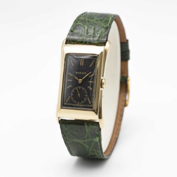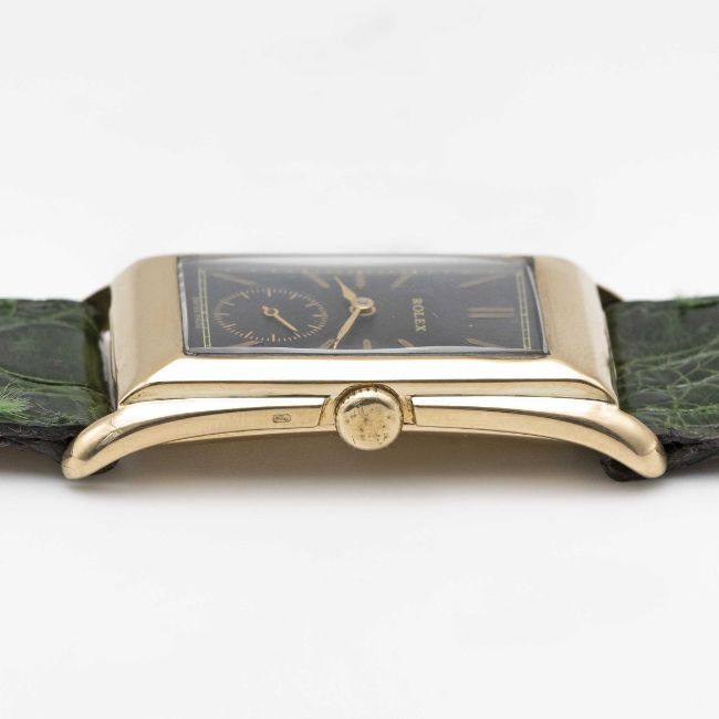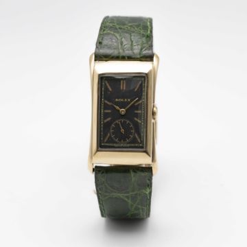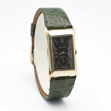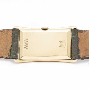 A GENTLEMAN'S 18K SOLID GOLD ROLEX BRANCARD "PRINCE" FLARED RECTANGULAR WRIST WATCHCIRCA 1930s, REF. 2771 WITH REFINISHED DIALMovement: 17J, manual wind "Ultra Prima", signed Rolex Timed 6 Positions.Case: Approx. 42mm by 24mm at widest point, flared rectangular case, Rolex coronet on case back, signed Rolex 25 Records Universels, 18k hallmarks, numbered 29,xxx. Strap: Leather.  CONDITION REPORTDial: Refinished dial in very good condition. Movement: Running & functioning at present, timekeeping and accuracy cannot be guaranteed. Case: In very good condition, with light wear due to general use. Strap: In very good condition.