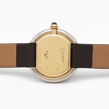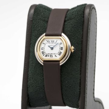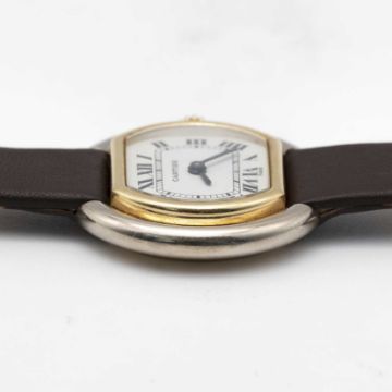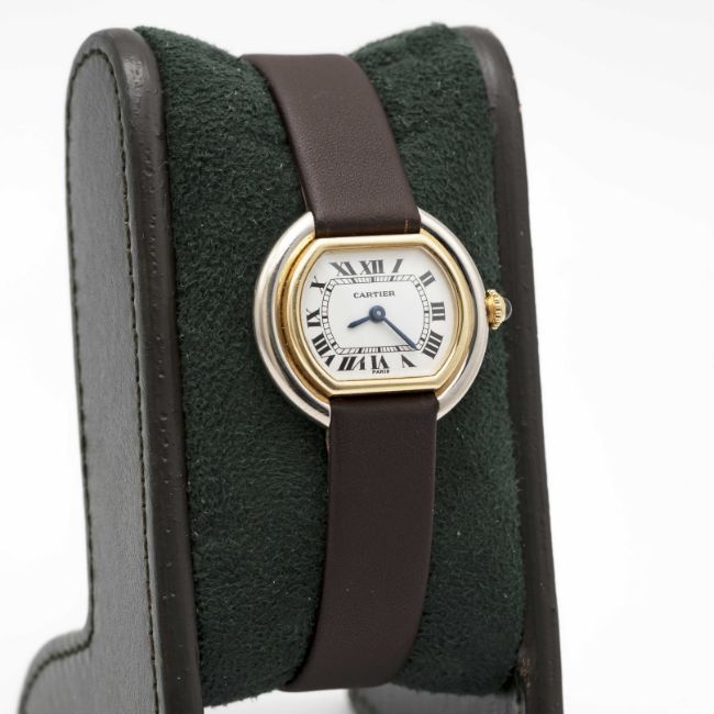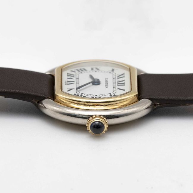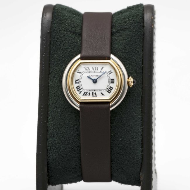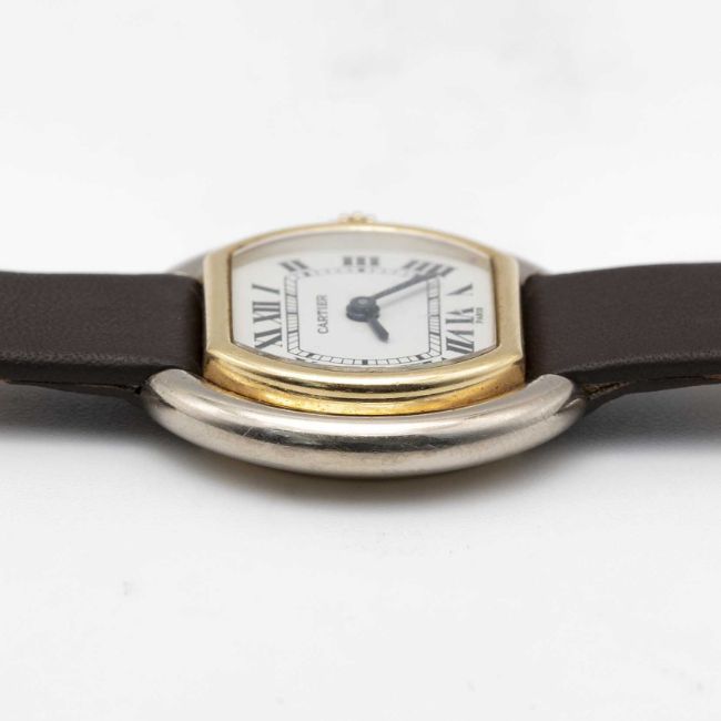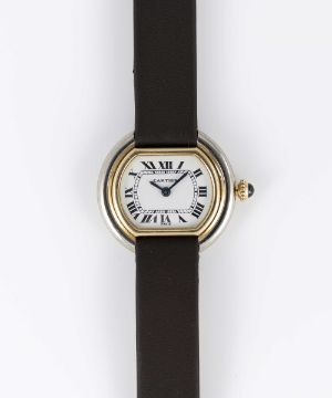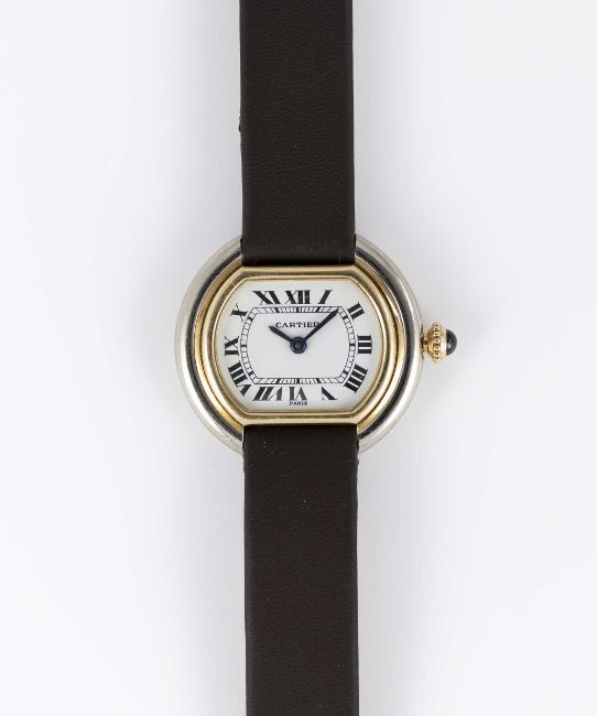 A LADIES 18K YELLOW & WHITE GOLD CARTIER PARIS ELLIPSE WRIST WATCHCIRCA 1970s, REF. 6711Movement: Manual wind, signed Cartier.Case: Width approx. 26.5mm, signed Cartier Paris, numbered, 18K hallmarks, sapphire crown.Strap: Leather strap with gold plated Cartier pin buckle.CONDITION REPORTDial: Original dial in good condition, with some crazing due to age.Movement: Running & functioning at present, timekeeping and accuracy cannot be guaranteed.Case: In very good condition, with scratches due to general use.Strap/Bracelet: In excellent condition with some light wear to the pin buckle.