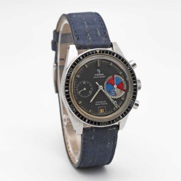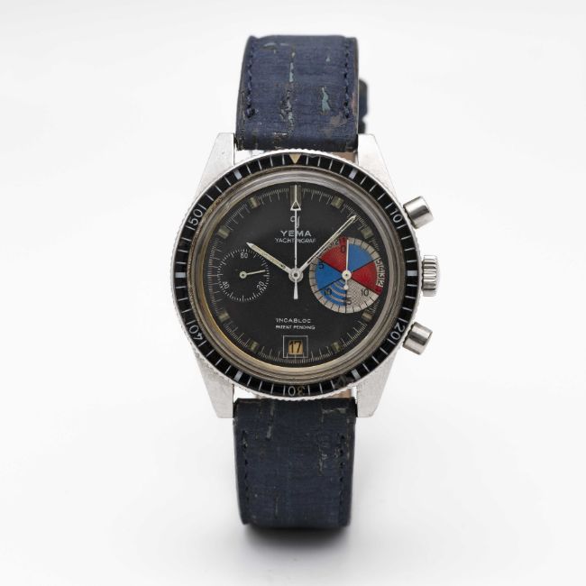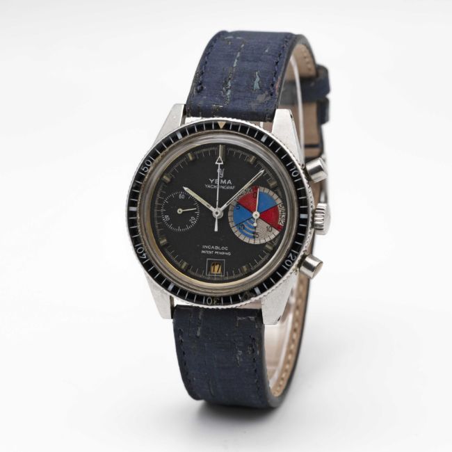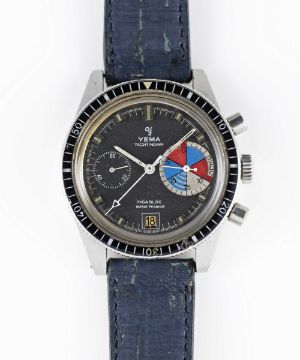 A GENTLEMAN'S STAINLESS STEEL YEMA YACHTINGRAF CHRONOGRAPH WRIST WATCHCIRCA 1968, PATENT PENDING MODEL WITH PORTUGUESE IMPORT MARKMovement: 17J, manual wind, Valjoux cal. 7734.Case: Diameter approx. 39mm, screw back, Portuguese import mark to top left lug, ref. 566737, 60 minute rotating acrylic bezel.Strap: Distressed style leather.CONDITION REPORTDial: Original dial in good condition, showing small signs of age.Movement: Running & functioning at present, timekeeping and accuracy cannot be guaranteed.Case: In fair condition, with small scratches & signs of wear due to general use, bottom pusher worn.Strap/Bracelet: In very good condition.