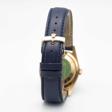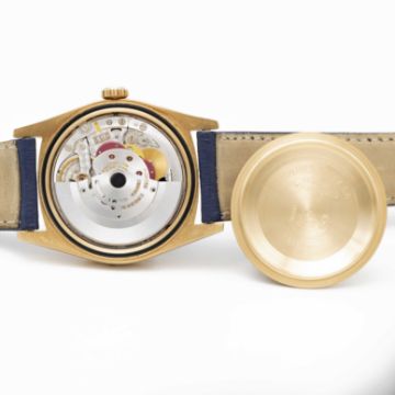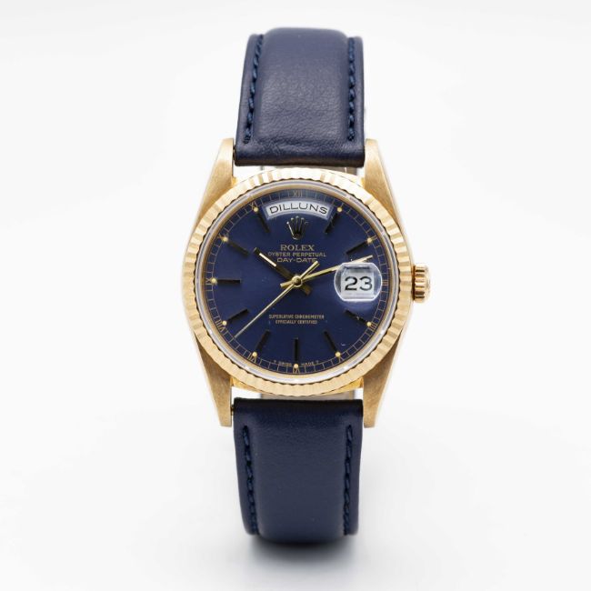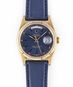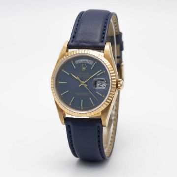 A GENTLEMAN'S 18K SOLID YELLOW GOLD ROLEX OYSTER PERPETUAL DAY DATE WRIST WATCHCIRCA 1990, REF. 18238 WITH BLUE DIAL & CATALAN DAY DISPLAY, ORIGINAL ROLEX CASE BACK STICKER STILL APPLIED  Movement: 31J, automatic chronometer, double quick-set day & date, cal. 3155, signed Montres Rolex S.A., numbered.Case: Diameter approx. 36mm, Oyster case, signed Montres Rolex S.A., E serial no. 18k hallmarks, fluted bezel, sapphire crystal, Rolex crown. Strap: Leather CONDITION REPORTDial: Original dial in very good condition, with some small signs of age. Movement: Running & functioning at present, timekeeping and accuracy cannot be guaranteed. Case: In excellent condition. Strap/Bracelet: In excellent condition.