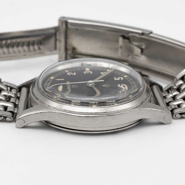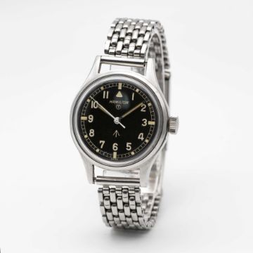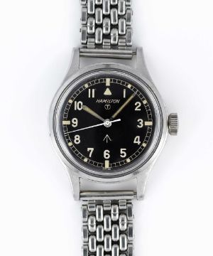 A GENTLEMAN'S STAINLESS STEEL BRITISH MILITARY HAMILTON RAF PILOTS WRIST WATCHCIRCA 1960sMovement: 17J, manual wind with hacking seconds, cal. 75S, signed Hamilton.Case: Diameter approx. 36mm, fixed bars, screw back, signed Hamilton Watch Co, issue markings ^ 6B-9101000 H 0872 M, dust cover.Strap: Montal stainless steel bracelet with adjustable clasp. CONDITION REPORTDial: Original dial in excellent condition showing small signs of age.Movement: Running & functioning at present, timekeeping and accuracy cannot be guaranteed.Case: In very good condition, with some scratches due to military use.Bracelet: In very good condition, with some light scratches due to military use.