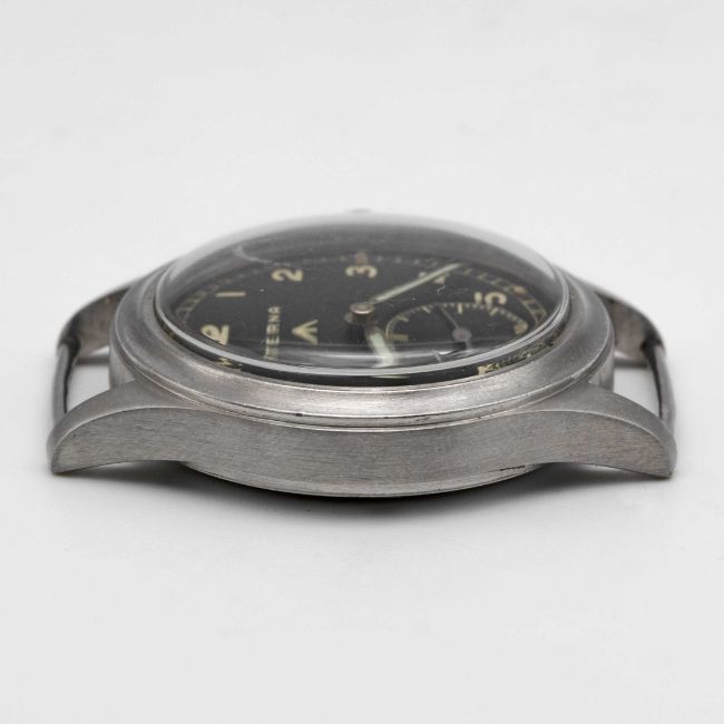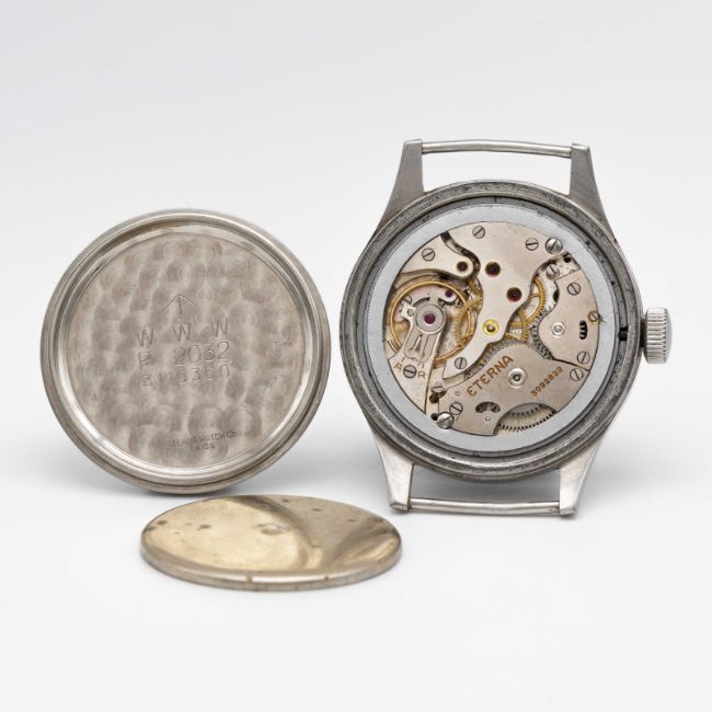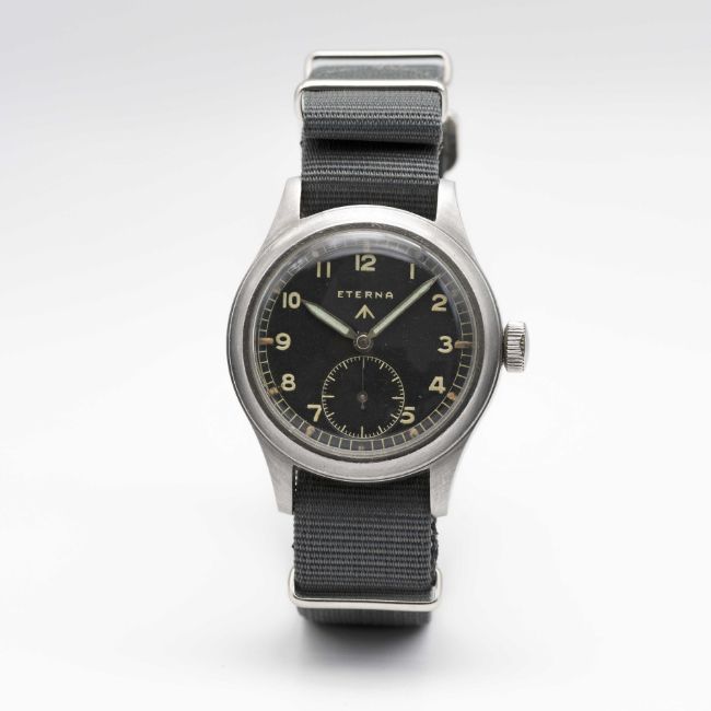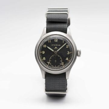 A GENTLEMAN'S STAINLESS STEEL BRITISH MILITARY ETERNA W.W.W. WRIST WATCHCIRCA 1945, PART OF THE "DIRTY DOZEN"Movement: 15J, manual wind, cal. 520H, signed Eterna, numbered.Case: Diameter approx. 36mm, fixed bars, screw back, signed Eterna Watch Co, issue markings ^ W.W.W. P2032 3110360, dust cover.Strap: NATO.CONDITION REPORTDial: Original dial in very good condition, showing some small signs of age.Movement: Running & functioning at present, timekeeping and accuracy cannot be guaranteed.Case: In very good condition, with some light scratches due to use.Strap: In excellent condition.