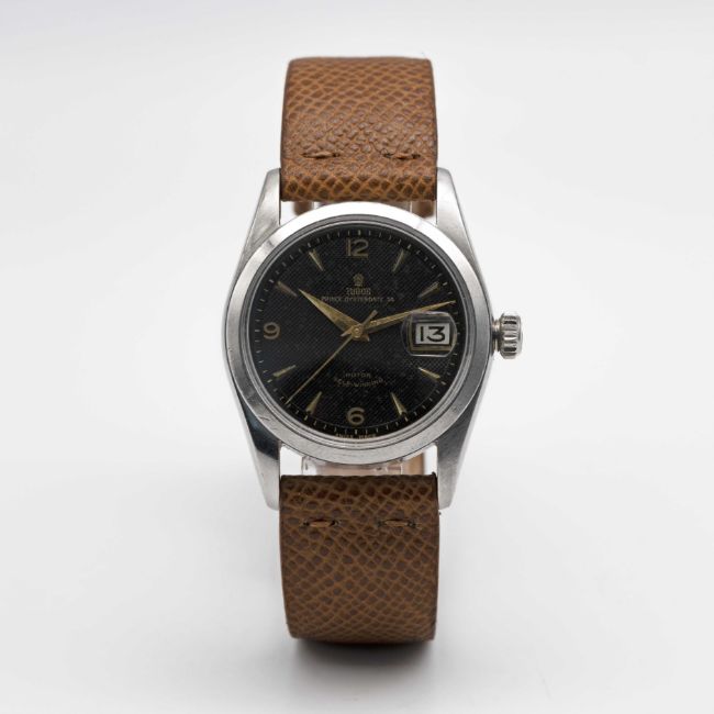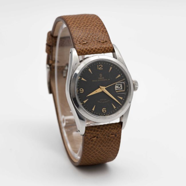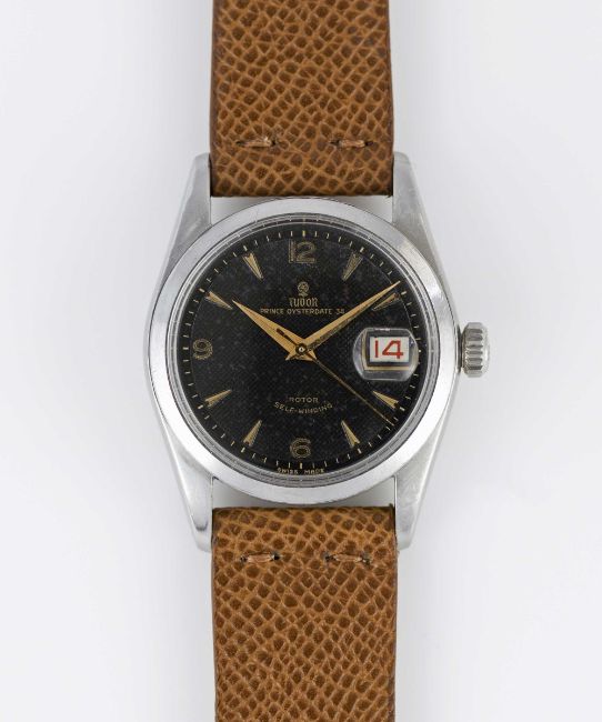 A RARE GENTLEMAN'S STAINLESS STEEL ROLEX TUDOR PRINCE OYSTERDATE 34 WRIST WATCHCIRCA 1950s, REF. 7944 WITH GLOSS BLACK "HONEYCOMB" DIAL & "ROULETTE" DATEMovement: 17J, automatic, "butterfly" rotor, signed Tudor Auto-Prince.Case: Diameter approx. 35mm, Oyster case, signed Montres Tudor S.A., no visible numbers, Rolex crown.Strap: Leather.CONDITION REPORTDial: Original dial in very good condition, showing small signs of age.Movement: Running & functioning at present, timekeeping and accuracy cannot be guaranteed.Case: In good condition, with some scratches and wear due to general use.Strap/Bracelet: In excellent condition.