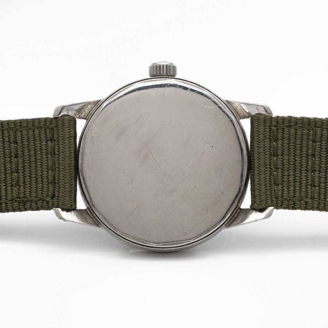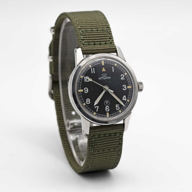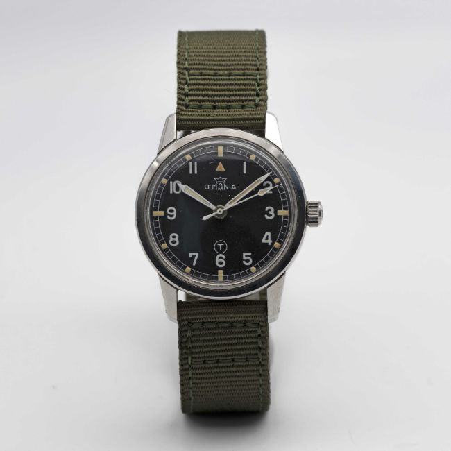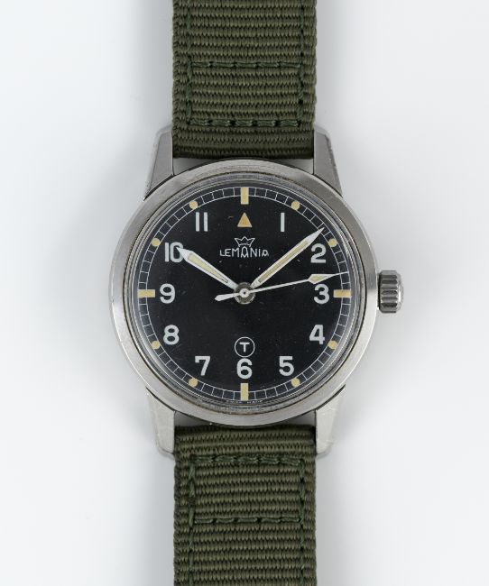A GENTLEMAN'S STAINLESS STEEL BRITISH MILITARY ROYAL NAVY LEMANIA WRIST WATCH CIRCA 1964, REF. 920-64 ORIGINALLY ISSUED TO ROYAL NAVY DIVING SUPERVISORS, WITH ISSUE MARKINGS ON CASE BACK & MILITARY ARROW ON THE DIAL REMOVED Movement: 17J, manual wind, cal. 3060, signed Lemania, numbered 1,6xx,xxx.Case: Diameter approx. 35mm, EPSA super compressor case with screw back, military markings polished from case back, numbered, original Lemania ant-slip crown. Strap: Textile. CONDITION REPORTDial: Original dial in very good condition, military arrow appears to have been removed.  Movement: Running & functioning at present, timekeeping and accuracy cannot be guaranteed. Case: In good condition, with some light scratches due to use.  Strap: In excellent condition.