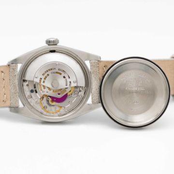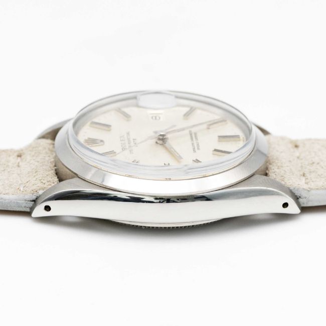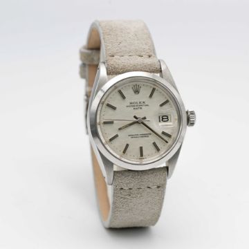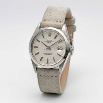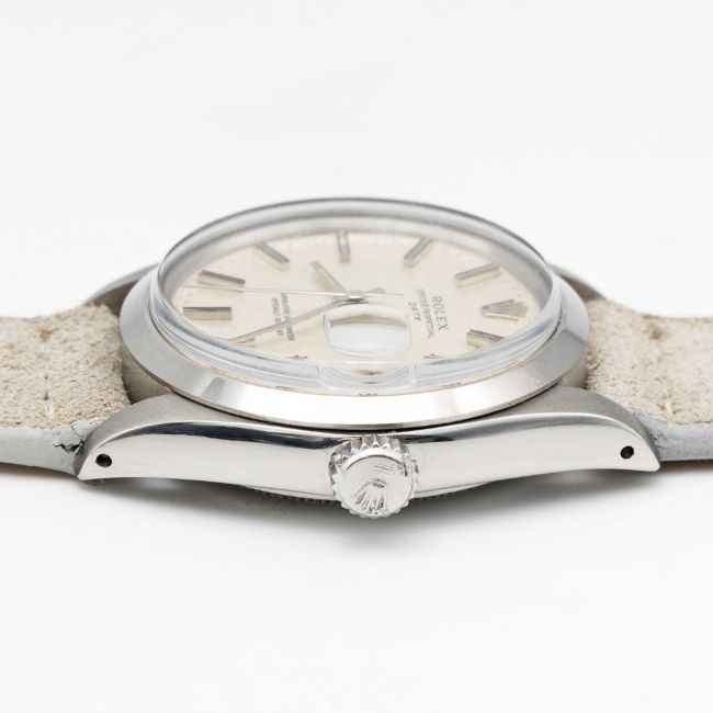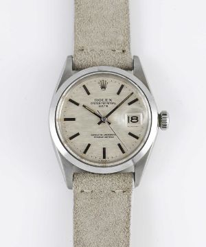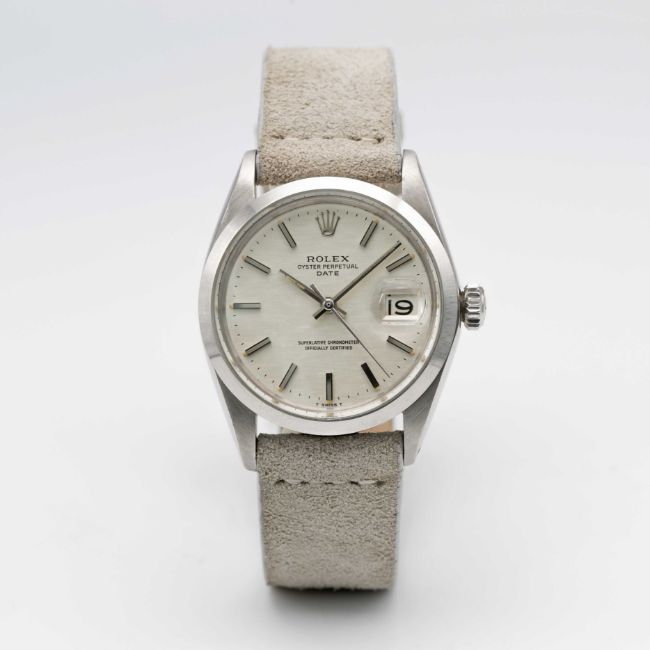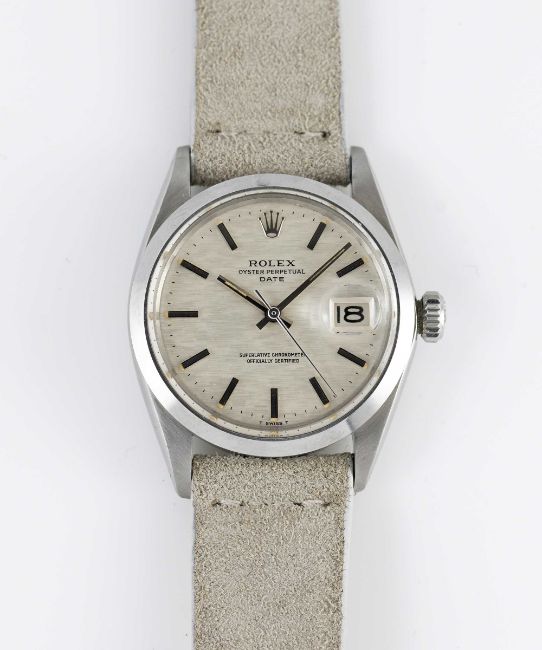 A GENTLEMAN'S STAINLESS STEEL ROLEX OYSTER PERPETUAL DATE WRIST WATCHCIRCA 1969, REF. 1500 WITH SILVER "MOSAIC" / "SHANTUNG" DIALMovement: 26J, automatic chronometer, cal. 1570, signed Montres Rolex S.A., numbered.Case: Diameter approx. 34.5mm, Oyster case, signed Montres Rolex S.A., dated IV.68, serial no. 1,9xx,xxx, Rolex crown.Strap: Leather.CONDITION REPORTDial: Original dial in very good condition.Movement: Running & functioning at present, timekeeping and accuracy cannot be guaranteed.Case: In excellent condition.Strap/Bracelet: In excellent condition.