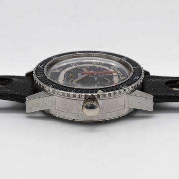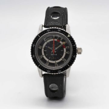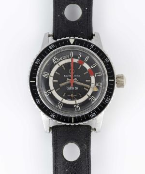 A RARE GENTLEMAN'S STAINLESS STEEL FAVRE LEUBA BATHY 50 DEPTH GAUGE DIVERS WRIST WATCHCIRCA 1960s, REF. 53243Movement: 17J, manual wind, signed Favre-Leuba. Case: Diameter approx. 40mm, screw back, pressure diaphragm inside allowing for indication of depth rating whilst diving with red hand corresponding to dial, signed Favre-Leuba with emblem embossed on case back, numbered 5xx, 60 minute rotating bakelite bezel, unsigned screw-down crown.Strap: Rubber strap.CONDITION REPORTDial: Original dial in good condition, showing some signs of age.Movement: Running at present, timekeeping and accuracy cannot be guaranteed. Pressure gauge does not appear to be functioning.Case: In good condition, with scratches due to general use.Strap: In fair condition.