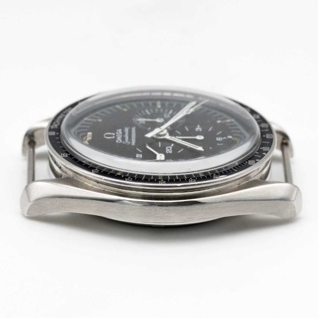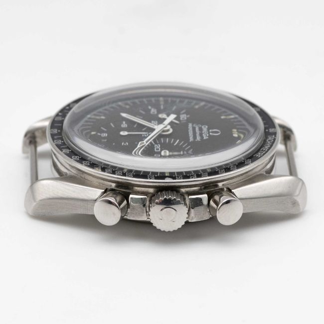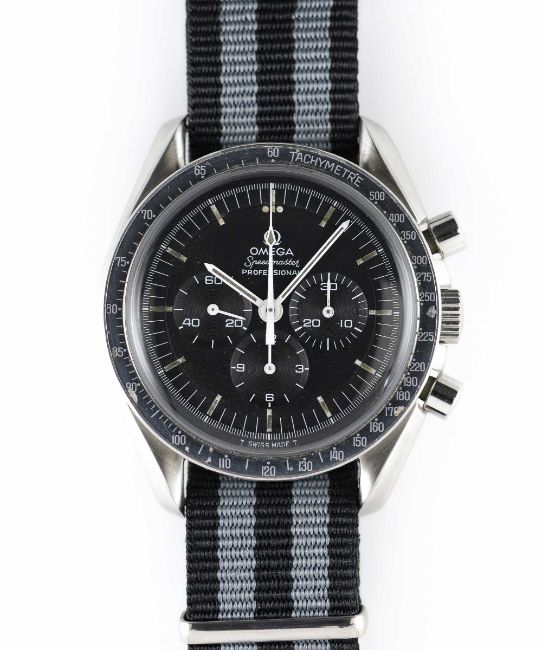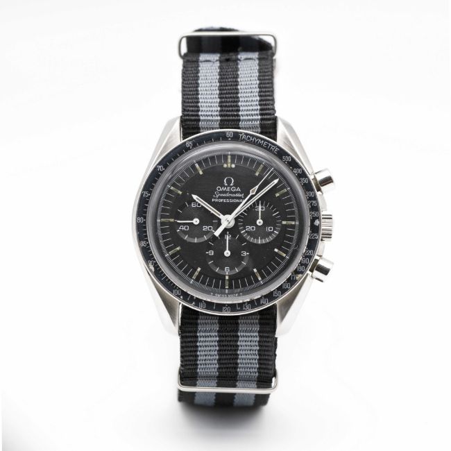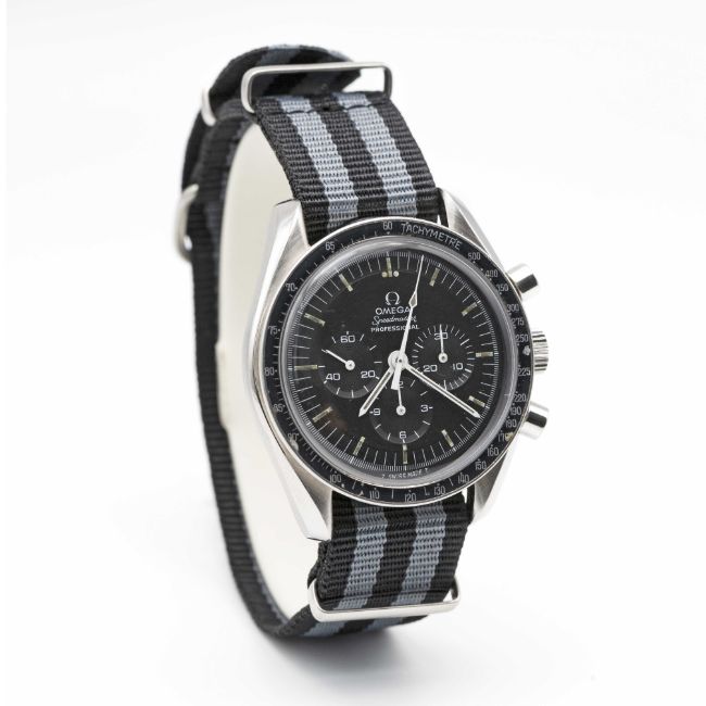 A RARE GENTLEMAN'S STAINLESS STEEL OMEGA SPEEDMASTER PROFESSIONAL CHRONOGRAPH WRIST WATCHCIRCA 1970, REF. 145.022-69 WITH 220 MISPRINT BEZELMovement: 17J, manual wind, cal. 861, signed Omega, numbered, 31,00x,xxx.Case: Diameter approx. 42mm, screw back, Speedmaster emblem embossed, signed Omega Watch Co, dust cover, 220 misprint tachymetre bezel, Omega crown.Strap: NATO. CONDITION REPORTDial: Original dial in excellent condition, showing some small signs of age, luminous showing a strong patina.Movement: Running & functioning at present, timekeeping and accuracy cannot be guaranteed.Case: In very good condition, bezel nicely faded.Strap/Bracelet: In excellent condition.