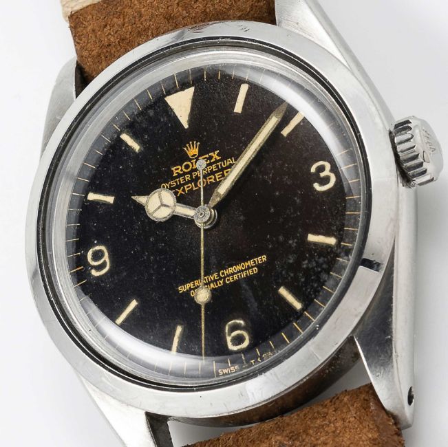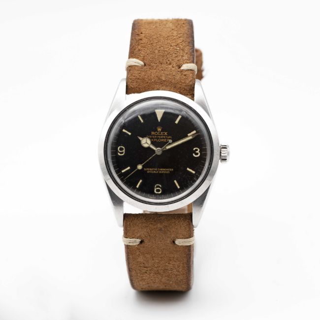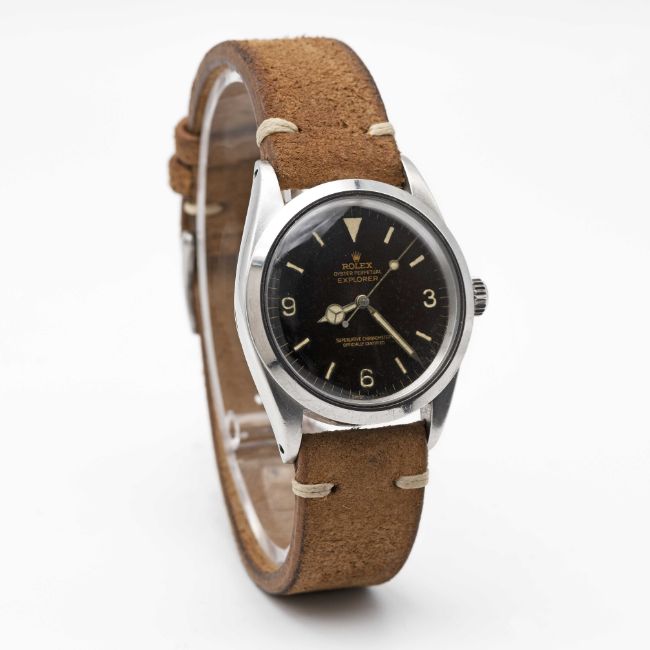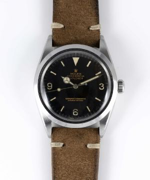 A GENTLEMAN'S STAINLESS STEEL ROLEX OYSTER PERPETUAL EXPLORER WRIST WATCHCIRCA 1964, REF. 1016 WITH "TROPICAL" GILT DIALMovement: 26J, automatic chronometer, cal. 1560, signed Montres Rolex S.A., numbered.Case: Diameter approx. 36mm, Oyster case, signed Montres Rolex S.A., dated II.64, serial no. 1,0xx,xxx, Rolex crown.Strap: Leather.  CONDITION REPORTDial: Original dial in good 'tropical' condition showing signs of age. Movement: Running & functioning at present, timekeeping and accuracy cannot be guaranteed. Case: In very good condition, with some scratches and wear due to general use. Strap/Bracelet: In excellent condition.