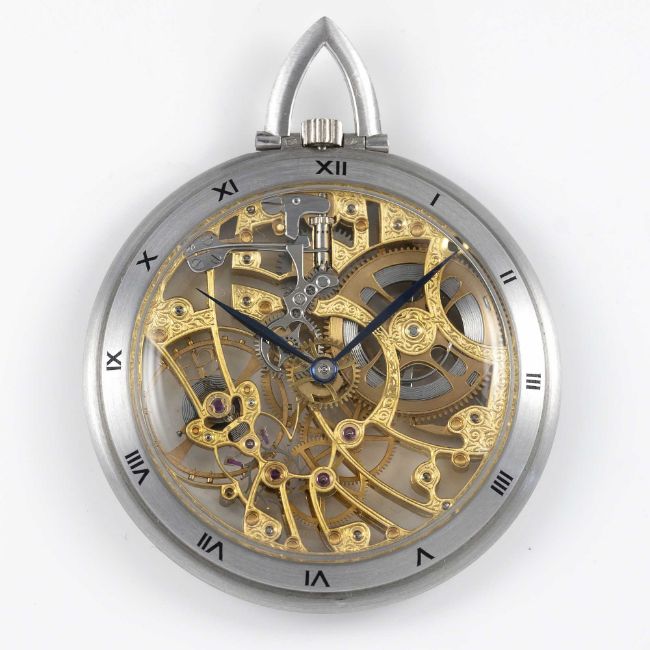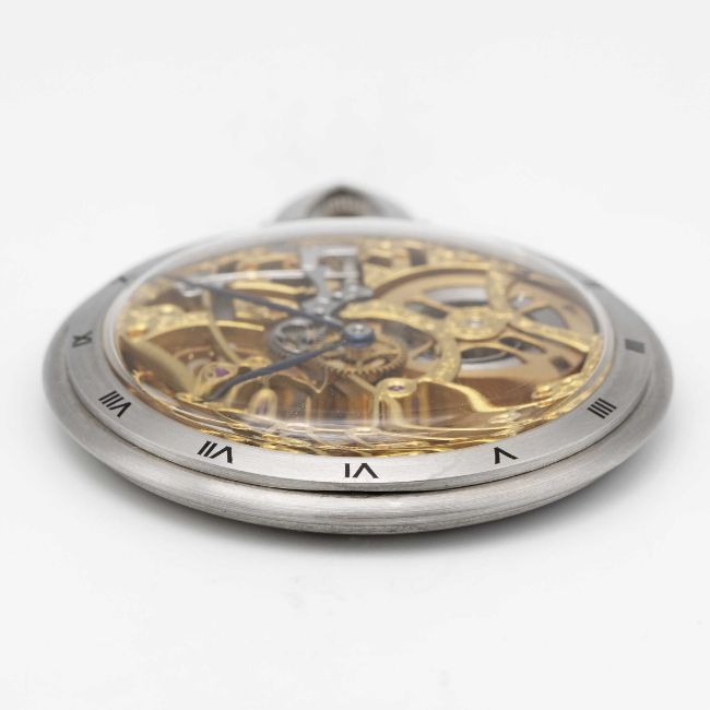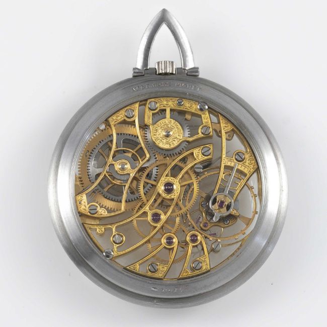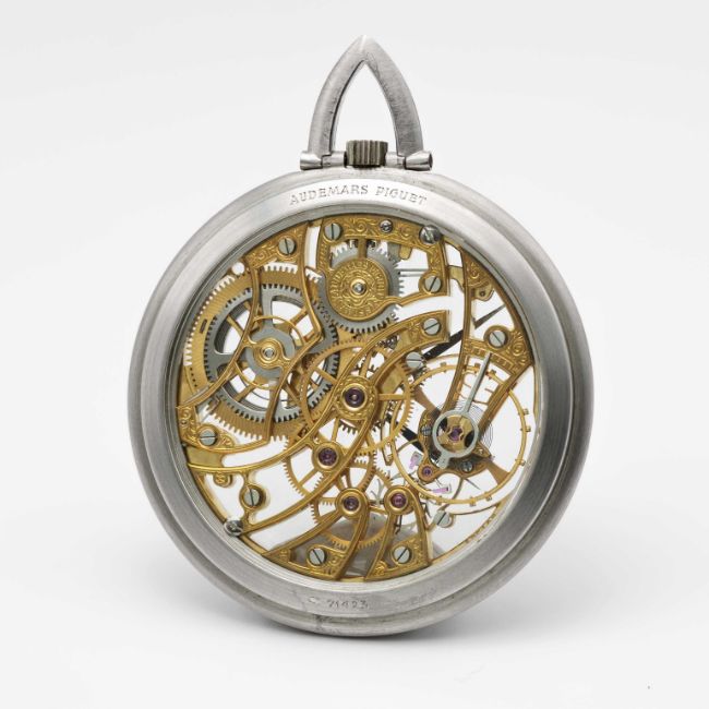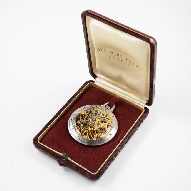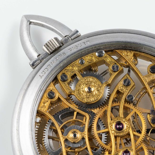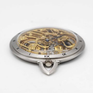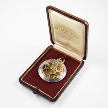 A FINE & RARE GENTLEMAN'S SIZE 18K SOLID WHITE GOLD AUDEMARS PIGUET SKELETONISED POCKET WATCHCIRCA 1970s ACCOMPANIED BY AN  AUDEMARS PIGUET BOXMovement: 17J, manual wind, signed Audemars Piguet, signed 12x,xxx.Case: Diameter approx. 47mm, exhibition snap back, outer Roman numerals, signed Audemars Piguet, numbered 71,xxx, 18k hallmarks.CONDITION REPORTMovement: Running & functioning at present, timekeeping and accuracy cannot be guaranteed.Case: In excellent condition, with very light scratches due to general use.